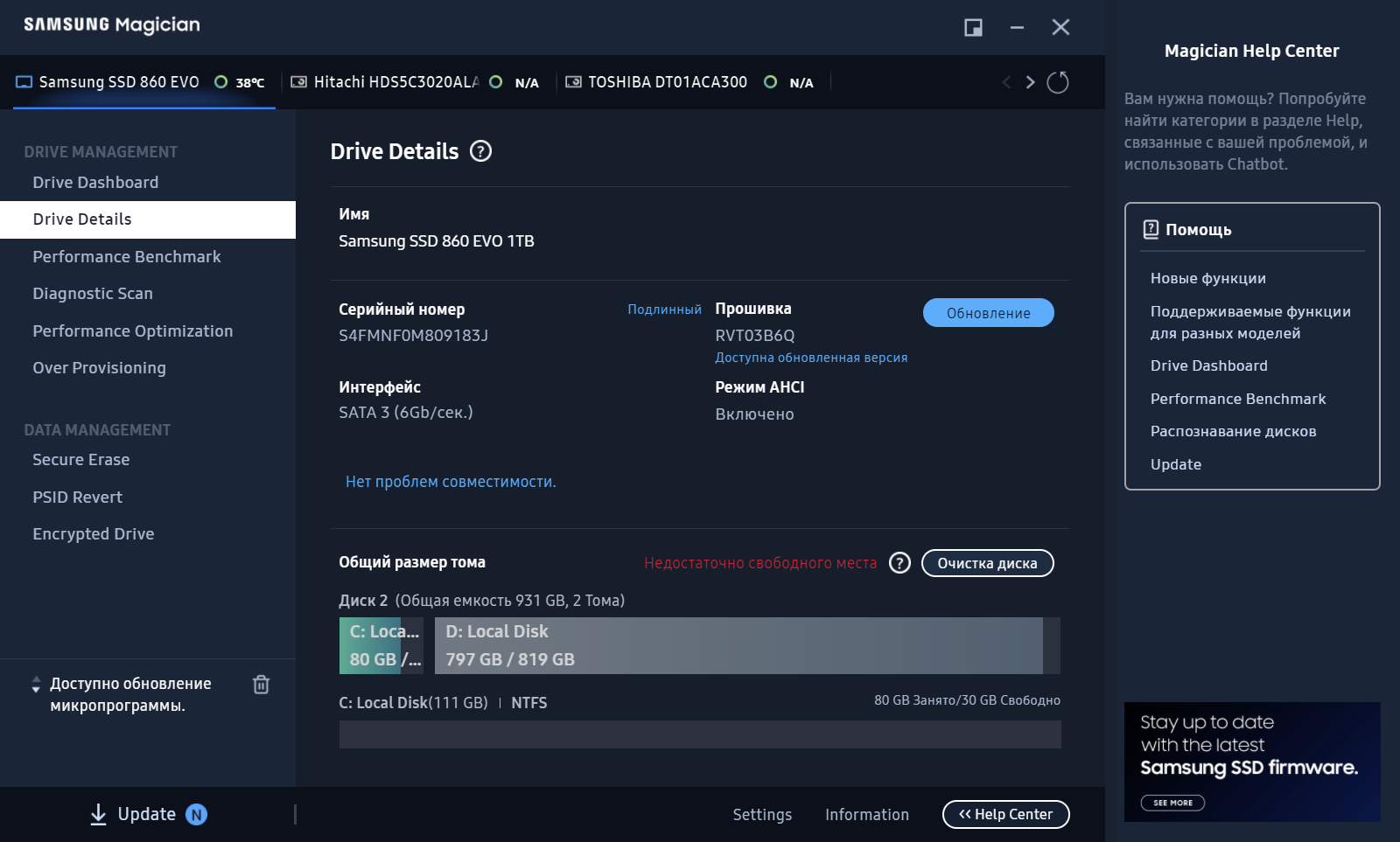 Купил Samsung 860 EVO 1TB в конце 2019. Всего лишь 28TB пробега, хотя торрент на нем установлен Надо ли обновлять прошивку ? Если никаких проблем не заметил ?