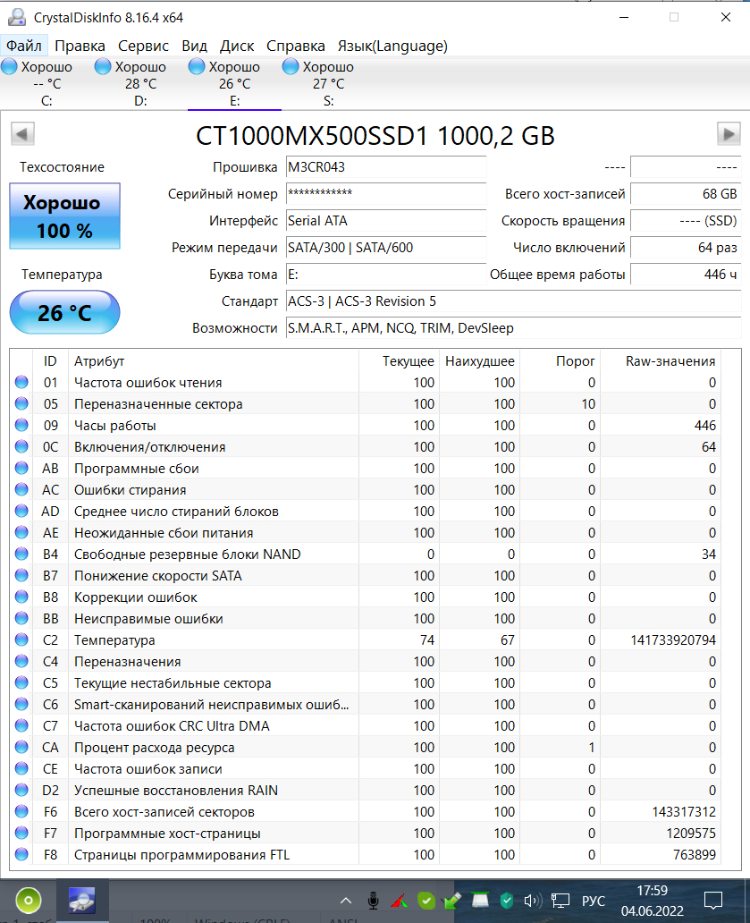 ========================================= Перед публикацией скриншотов Crystal Disk Info в меню "Сервис" >> "Дополнительно" >> "Raw-значения" выберите вариант "10 [DEC]". Это упростит восприятие информации. В меню "Сервис" ставьте галочку "Скрыть серийный номер".