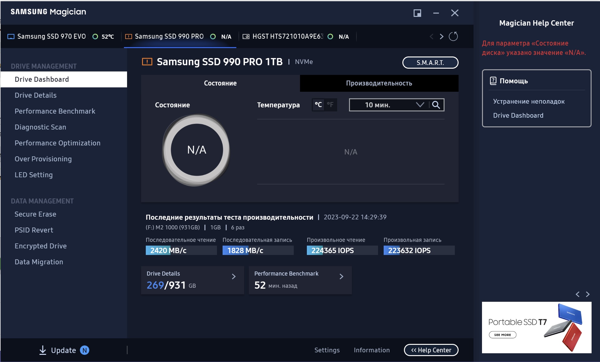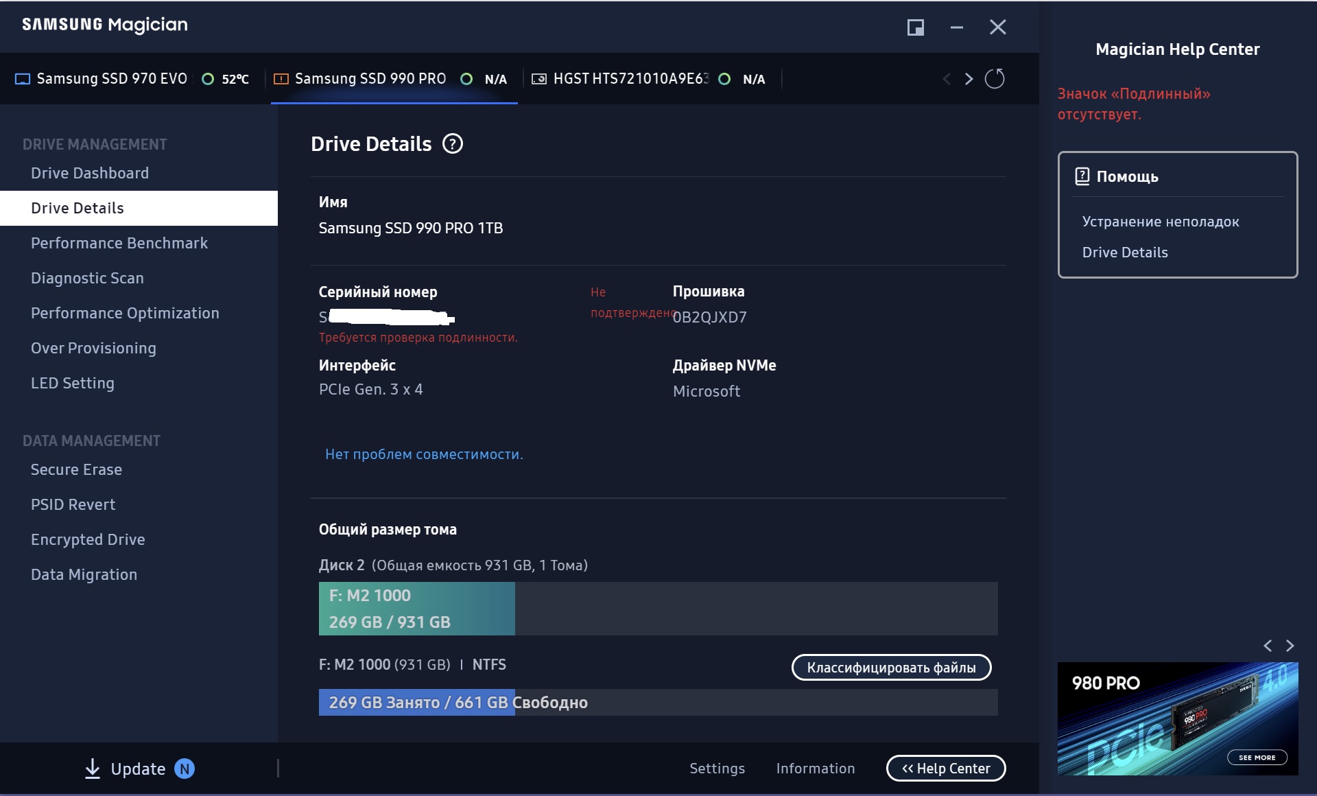Всем добра! Вопрос собственно таков. Купил 990pro, запустился. В проге Samsung Magician пишет "требуется проверка подлинности". С бубнами танцевал, дрова переустановил, обновил, пробовал разные версии проги от самсунга не хочет определять подлинность. Кто сталкивался? Ах да еще и скорость как-то не о чем!)