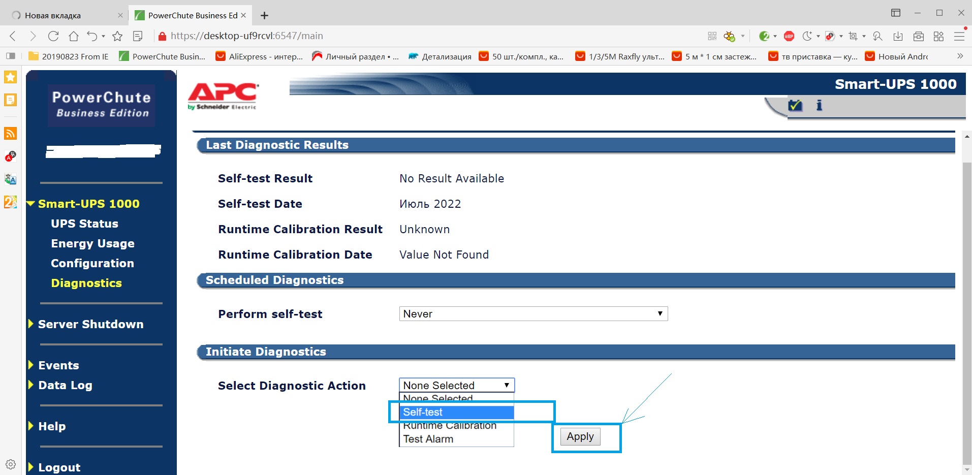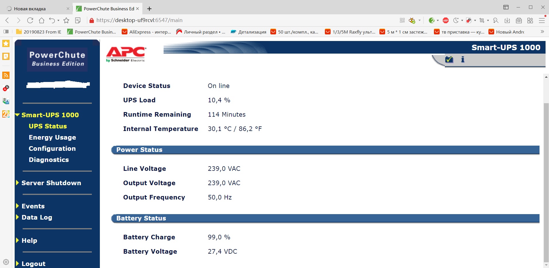 эта диагностика средствами самого APC ни о чем не говорит - он может показывать 100% заряд, при этом, от срока эксплуатации выкипела вода из сепараторов в ячейках и батарея не выдержит и 15 секунд под нагрузкой, хотя при этом проходит все тесты. Вот тогда и приходит писец