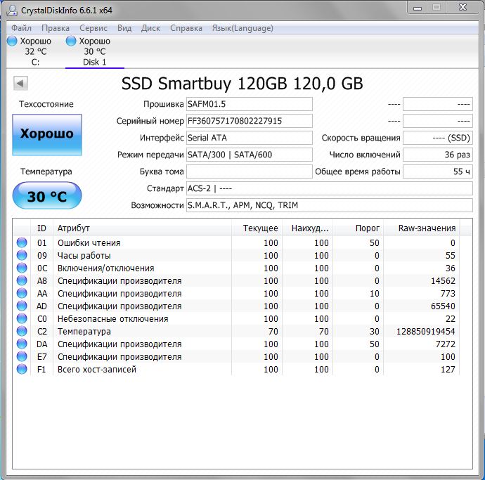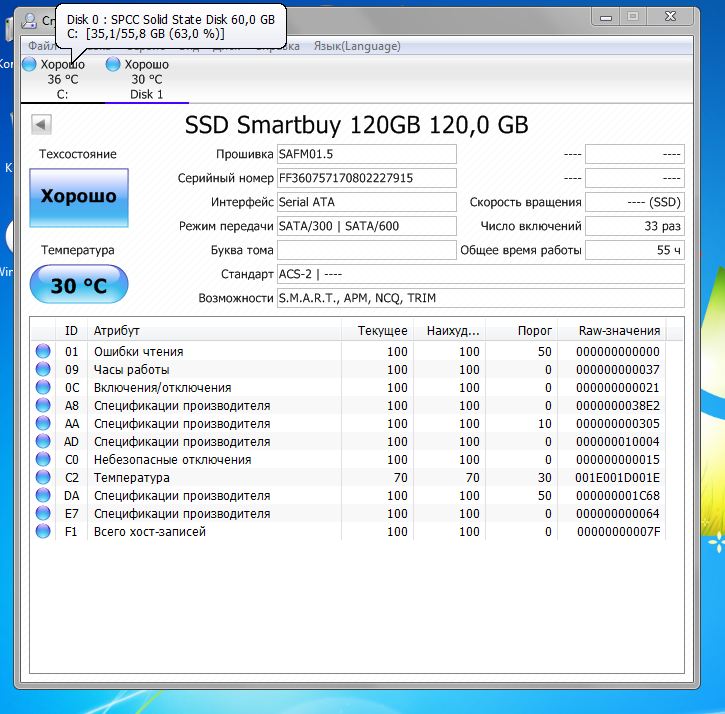 Вопрос знатокам. Взял смартбай игнишн 4 120 Гб. Хотел добавить в комп. Не смог поставить винду 10, зависал на посткоде 22 после первого ребута. Воткнул все-таки но семерку. Потом в самой винде ловил зависоны. Решил посмотреть смарт, но не знаю как его трактовать у ссд - объясните плиз - все плохо? Прикрепил скрин.