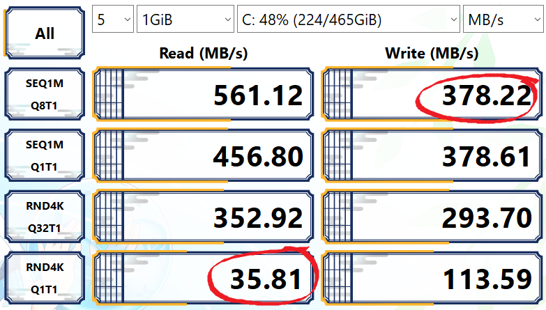 В первой строке? - несомненно... Из всех результатов это правда единственный хороший. Но вот обычное повседневное (Q1T1) чтение (во второй строке) должно как правило быть всего на 15-20МБ/с ниже, а у Вас оно ниже на 105... Ну разве остальная система слабовата. По личному опыту знаю, что у AMD х570-мамок запись чутка слабее (480-490), но не настолько. И заметно слабее Рандом4К в 3й строке - но тут у Вас как раз наоборот неплохие результаты. Так что не исключаю что это особенности (экзотической) системы. pSLC-кэша у неё по крайней мере 4+18 должно быть, то есть в лёгких бенчах сильных просадок быть не должно. Прошивка, кстати, какая у неё? Надеюсь не самая первая?