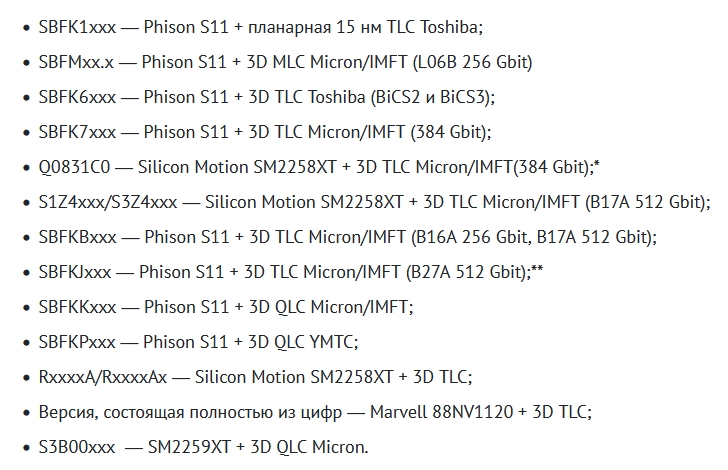 Список: - версия имеет обозначение вида "S8FM**.*" - PS3108-S8 + MLC NAND (ассортимент широк); - версия имеет обозначение вида "S9FM**.*" - PS3109-S9 + MLC NAND (ассортимент широк); - версия имеет обозначение вида "SAFM0*.*" или "SAFC0*.*" - PS3110-S10 + MLC NAND (19 nm Toshiba или 20 nm Micron/Intel); - версия имеет обозначение вида "SAFM1*.*" или "SAFC1*.*" - Phison PS3110-S10 + TLC NAND Toshiba (19 nm и 15 nm); - версия имеет обозначение вида "SBFM1*.*" - Phison PS3111-S11 + TLC NAND; - версия имеет обозначение вида "SAFZ1*.*" - Phison PS3110-S10 + 15 nm TLC NAND Toshiba; - версия имеет обозначение вида "5**ABBF*" или "6**ABBF*" - SandForce SF2281/SF2241 + MLC NAND (ассортимент широк); - версия имеет обозначение вида "20141516" - Silicon Motion SM2242XT + MLC NAND (ассортимент широк); - версия имеет обозначение вида "SBFM7*.*" - Phison PS3111-S11 + 16 nm TLC 3D V-NAND Micron. - версия имеет обозначение вида "V3.3" + накопитель в пластиковом корпусе - Marvell 88NV1120 + TLC 3D V-NAND Micron/Spectek.