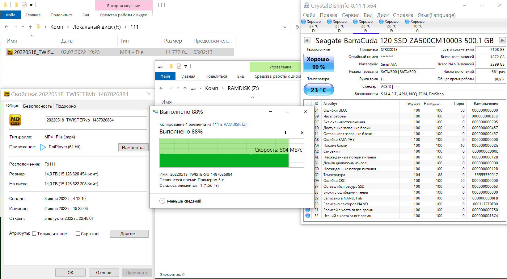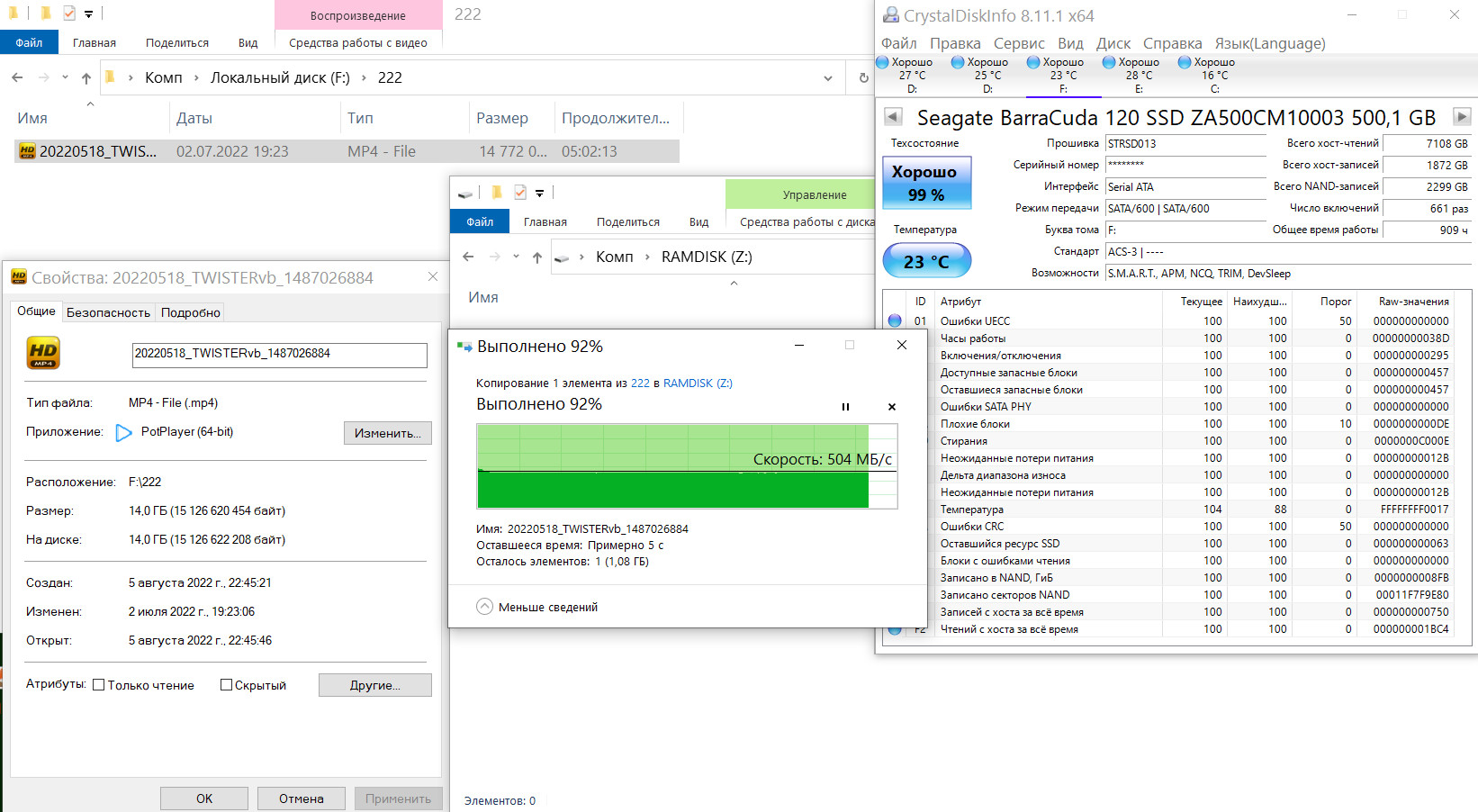 Причем уже через неделю скорость прилично падает, на мартовской папке с видео уже около 700мб/с средняя. Посмотрю что через год будет, самому интересно. Надо еще залить этот файл на ZA500CM10003, глянуть есть ли потеря на sata ssd.