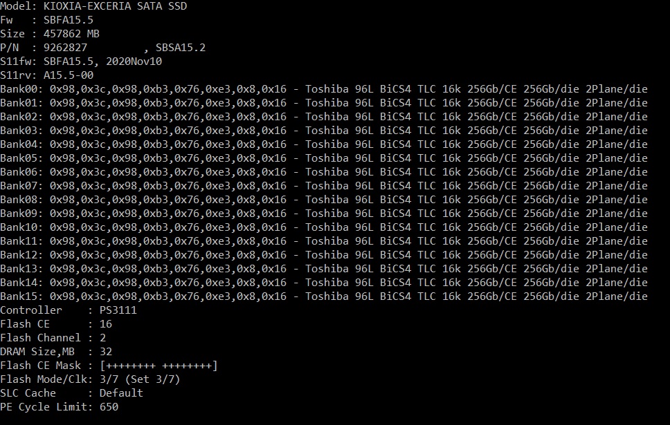 Silicon Motion идёт отдельно. У этих накопителей версия прошивки обычно выглядит как "*хххх#", где * - буква, обозначающая год ("O" соответствует 2015 году), а х - цифры обозначают конкретную дату сборки прошивки (0521 - 21 мая). # - буква, пока неясно. Прямого соответствия нет, но по косвенным признакам наблюдается несколько признаков: - конфигурации не пересекаются по версиям прошивок (например, O0730A, O0521A, O0803B5 - только Silicon Motion SM2256K + 16 nm TLC NAND SK Hynix; N0815B, O0919A - Silicon Motion SM2246EN + MLC NAND). - конфигурации на TLC NAND начались с прошивок вида O****.