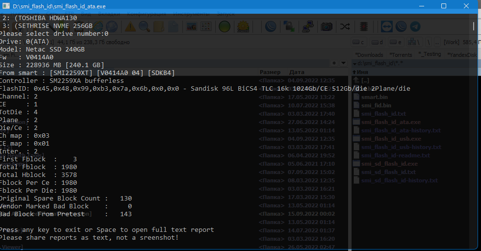 Silicon Motion идёт отдельно. У этих накопителей версия прошивки обычно выглядит как "*хххх#", где * - буква, обозначающая год ("O" соответствует 2015 году), а х - цифры обозначают конкретную дату сборки прошивки (0521 - 21 мая). # - буква, пока неясно. Прямого соответствия нет, но по косвенным признакам наблюдается несколько признаков: - конфигурации не пересекаются по версиям прошивок (например, O0730A, O0521A, O0803B5 - только Silicon Motion SM2256K + 16 nm TLC NAND SK Hynix; N0815B, O0919A - Silicon Motion SM2246EN + MLC NAND). - конфигурации на TLC NAND начались с прошивок вида O****.