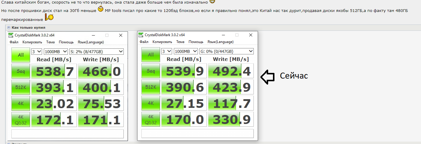 Добавлено спустя 24 минуты 12 секунд: Слава китайским богам, скорость не то что вернулась, она стала даже больше чем была изначально Но после прошивки диск стал на 30Гб меньше MP tools писал про какие то 120бэд блоков,но если я правильно понял,это Китай нас так дурит,продавая диски якобы 512ГБ,а по факту там 480ГБ перемаркированные