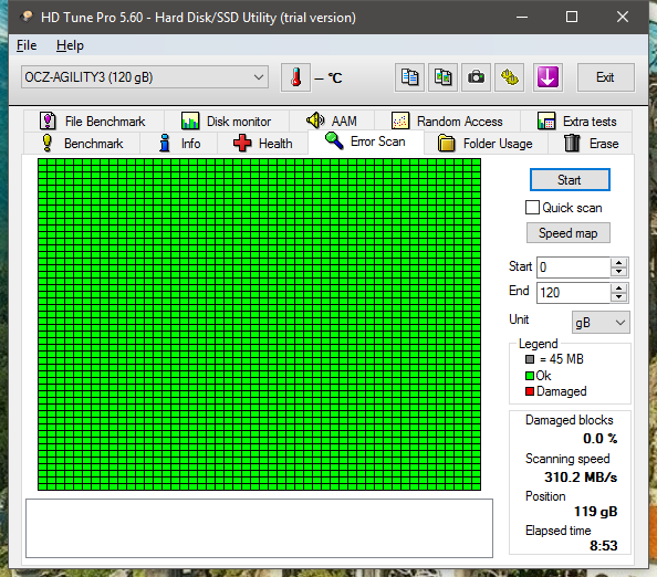 Имеется OCZ Agility 3 который служит мне с лета 2011 года. Недавно стала безбожно тормозить и глючить винда (Win10) с жалобами на SSD. Проверка показала, что не все гладко с ним
