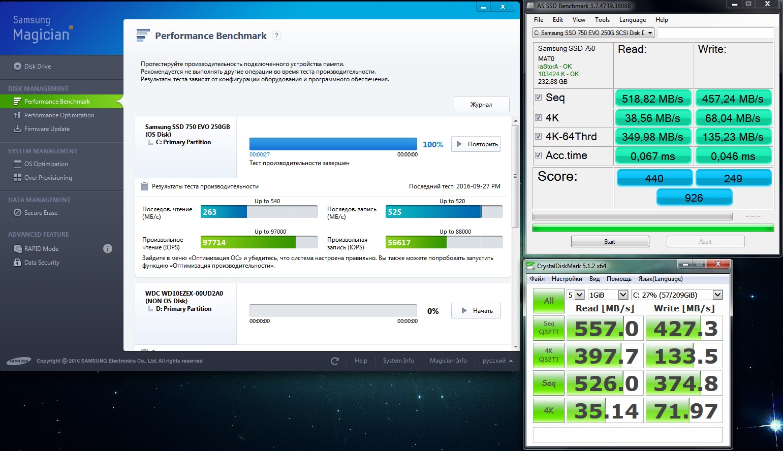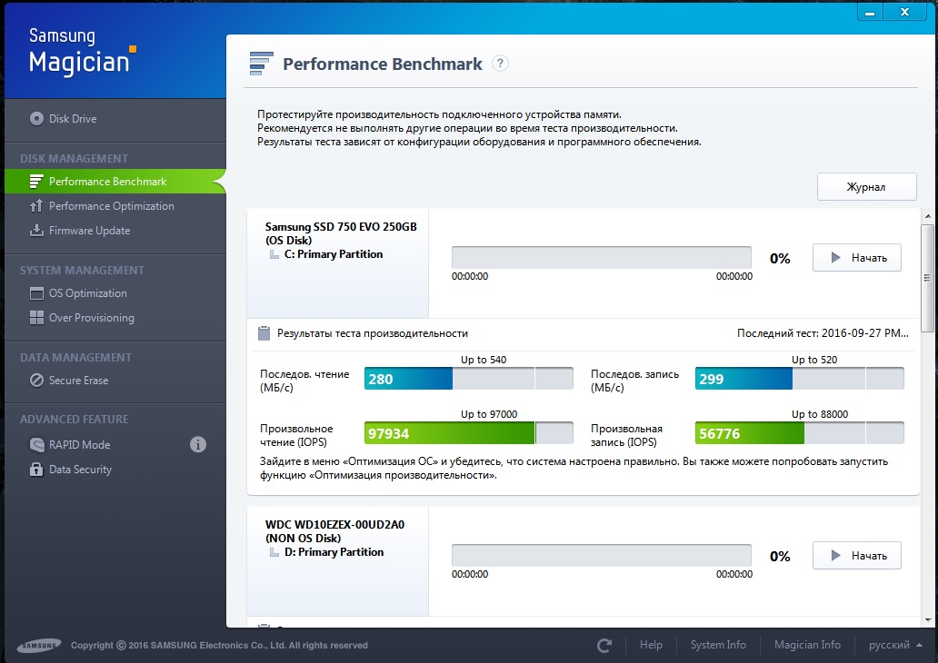 Здравствуйте. Подскажите, сделал тест скорости 750 EVO 250 Gb в Samsung Magician, включены опции: максимальная надёжность и over provisioning 10%, маловато вроде? Драйвер SetupRST 12.8.0.1016.