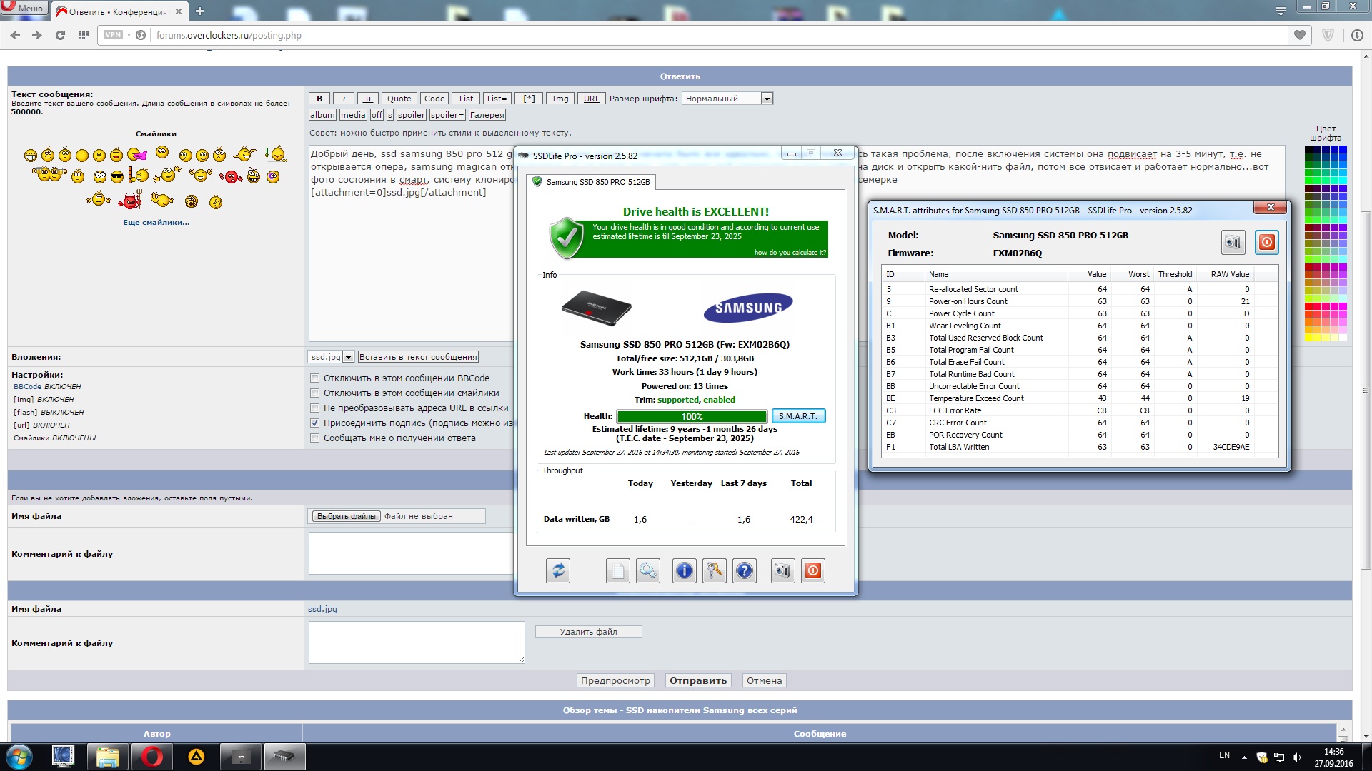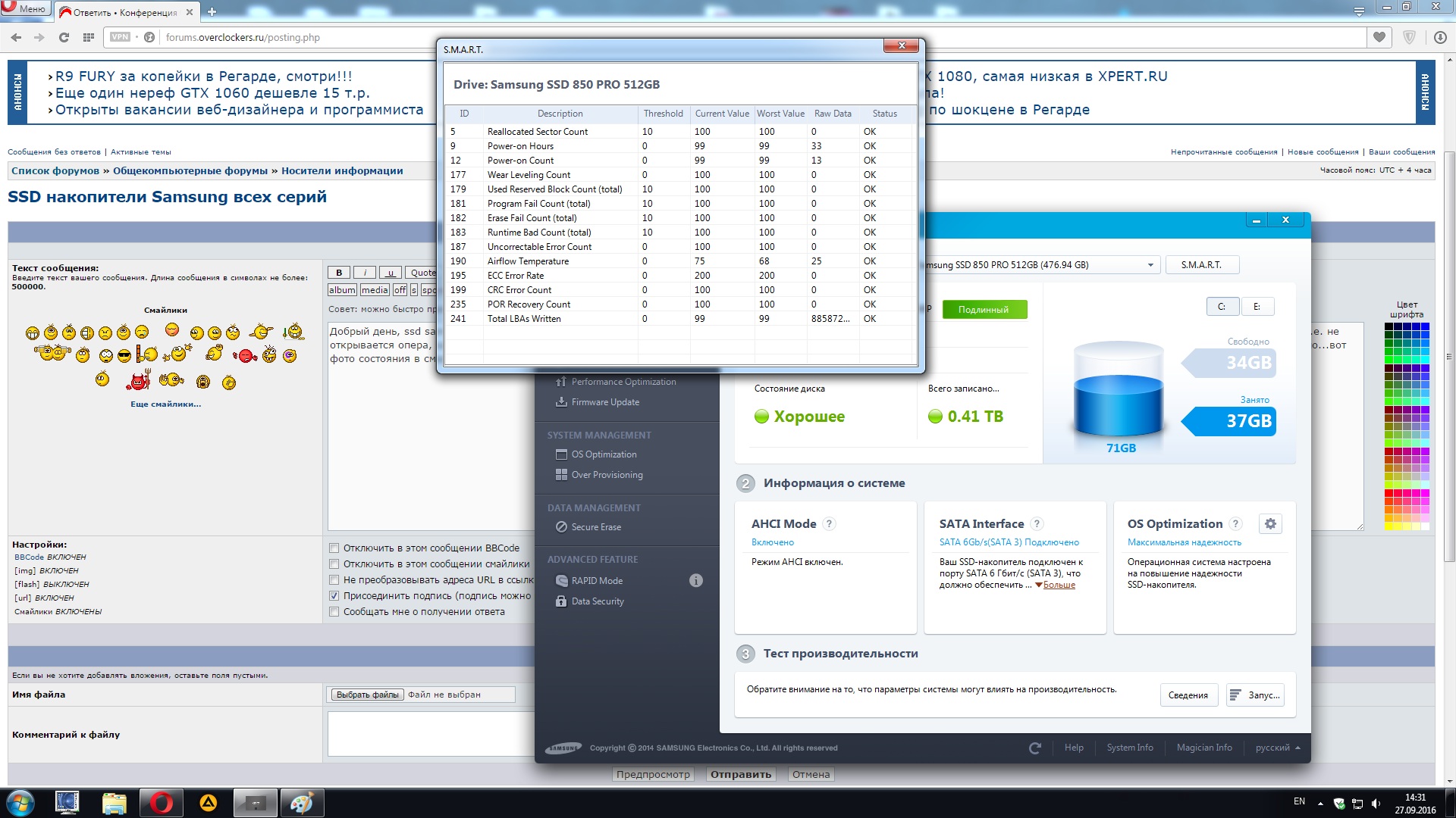 Добрый день, ssd samsung 850 pro 512 gb, куплен 4 дня назад...Сначала было все идеально, сегодня появилась такая проблема, после включения системы она подвисает на 3-5 минут, т.е. не открывается опера, samsung magican открывается, но не видит диск, хотя через мой компьютер я могу зайти на диск и открыть какой-нить файл, потом все отвисает и работает нормально...вот фото состояния в смарт, систему клонировал, но думаю раз сначала все было хорошо, то дело наверное не в семерке....что делать?