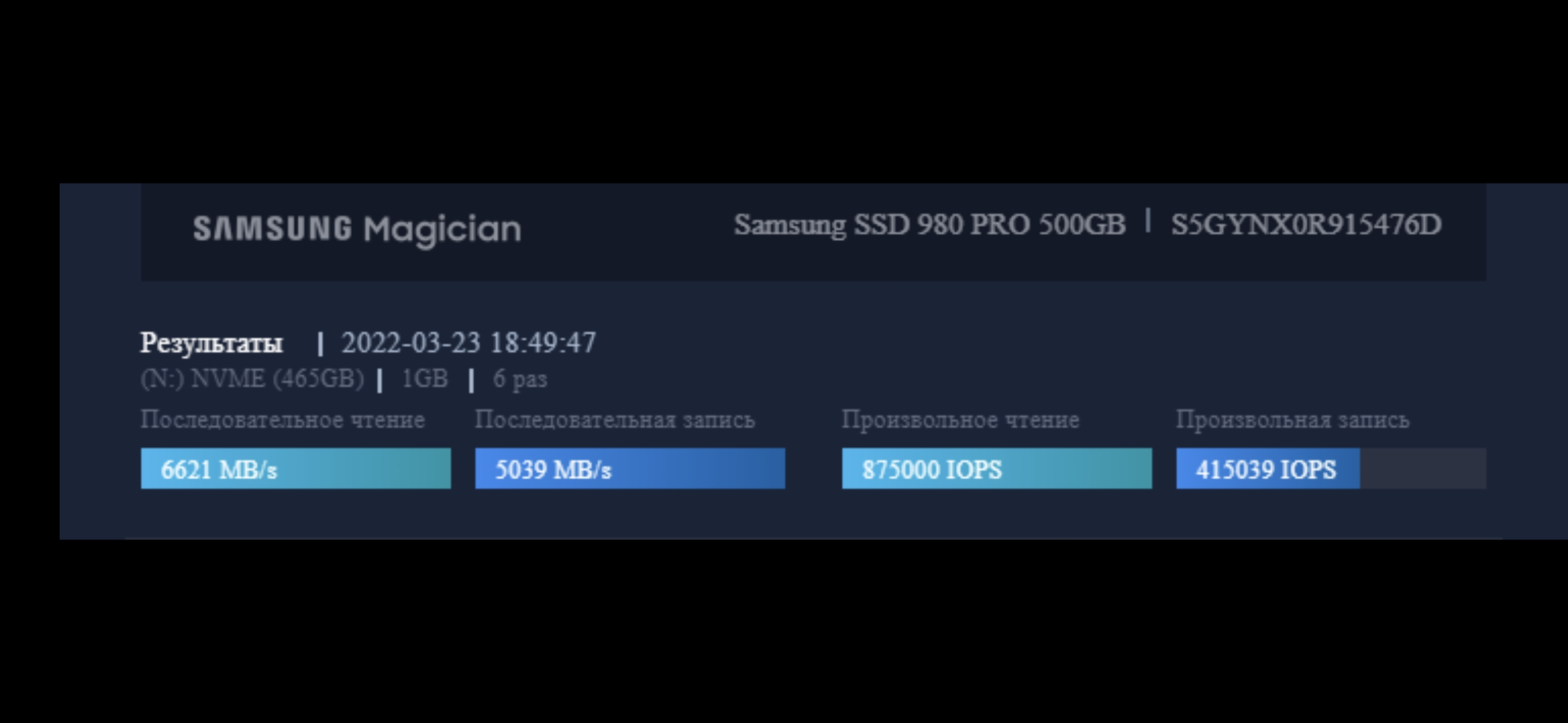 Где-то наткнулся на такой же тест (мб версии не совпадали?), там Magician показал ~1750/1250 тыс IOPS, что кратно больше.