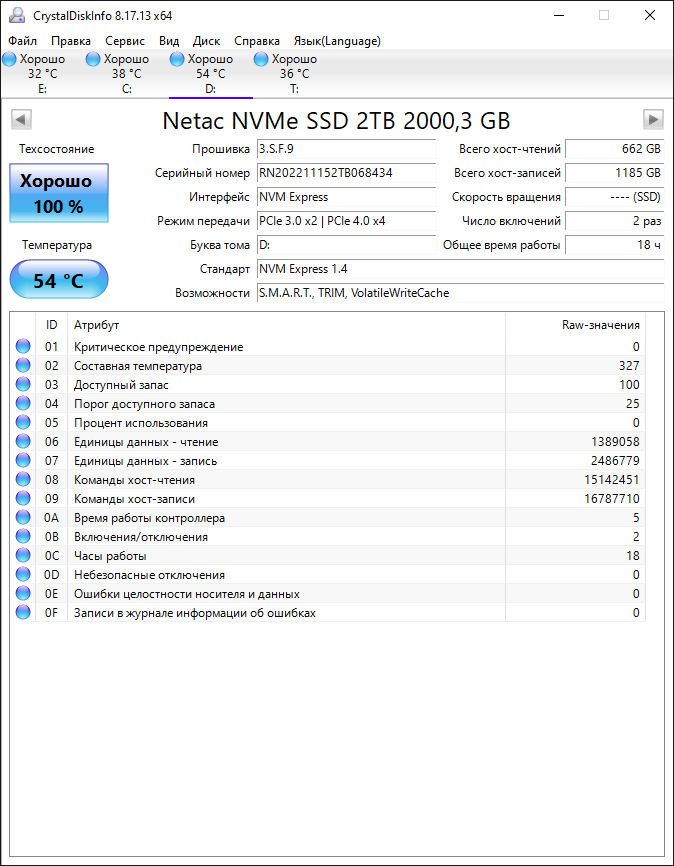 ========================================= Перед публикацией скриншотов Crystal Disk Info в меню "Сервис" >> "Дополнительно" >> "Raw-значения" выберите вариант "10 [DEC]". Это упростит восприятие информации. В меню "Сервис" ставьте галочку "Скрыть серийный номер".