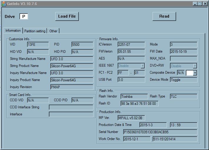 Volume: P: Controller: Phison PS2307 Possible Memory Chip(s): Not available Flash ID: 983AA493 7A50 Chip F/W: 05.01.10 Firmware Date: 2016-03-16 ID_BLK Ver.: 1.4.3.0 MP Ver.: MPALL v5.3.0B VID: 13FE PID: 5500 Manufacturer: UFD 3.0 Product: Silicon Power64G Query Vendor ID: UFD 3.0 Query Product ID: Silicon Power64G Query Product Revision: PMAP Physical Disk Capacity: 63350767616 Bytes Windows Disk Capacity: 63341330432 Bytes Internal Tags: 2Q6P-SX5G File System: EXFAT USB Version: 3.10 Declared Power: 504 mA ContMeas ID: 8924-11-00 Microsoft Windows XP SP3 Build 2600 ------------------------------------ http://www.antspec.com/usbflashinfo/ Program Version: 8.7.0.597