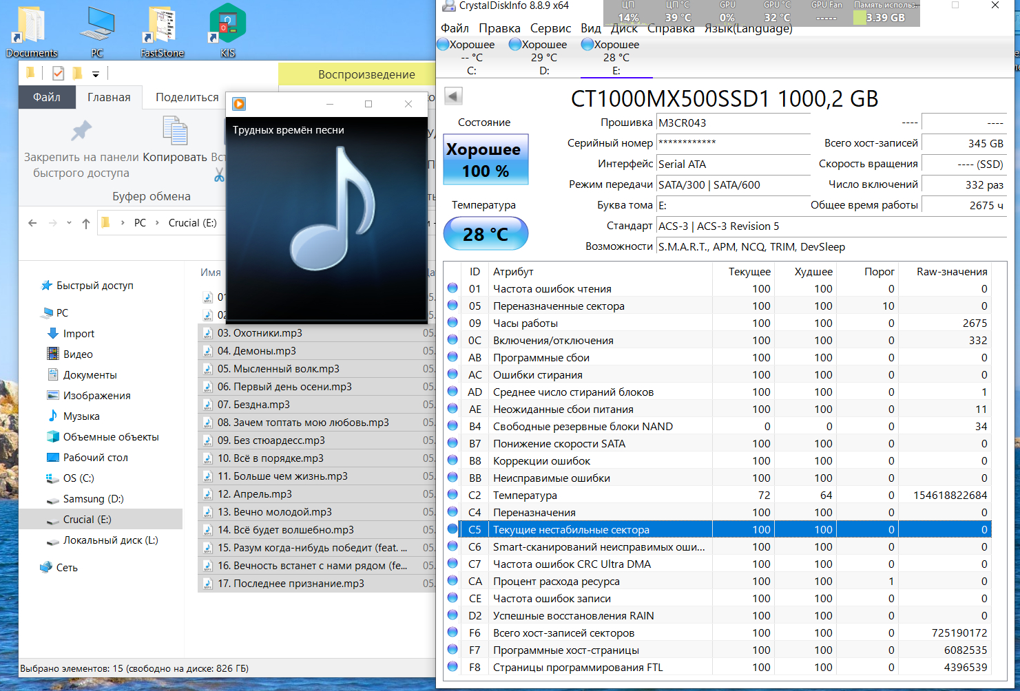 Ну это я как пример привел, было пару раз за месяц. У меня музыка играет по 6 часов в сутки Просто понаблюдай появляются у тебя С5 или нет иногда, оно и без музыки может появляться, ок? Отпиши потом. Может это характерно не для всех экземпляров. Как выше чувак писал "at least 10 (probably more) of our 96 MX500 drives reporting this SMART error" Судя по всей той информации что выше была, это вещь такая, массовая как буд-то.