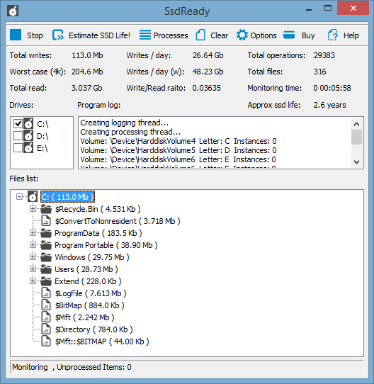 В зарегистрированной версии SSDReady нажмите правой кнопкой на диске C: (или любой интересующей папке) и выбирайте "This item and its children" и вам откроется окошко со списком программ, который "сожрали" подсчитанный объем записи. Для каждой программы будет указано, как много она записала на диск. И не нужно будет вам гадать, кто или что пишет максимально много.