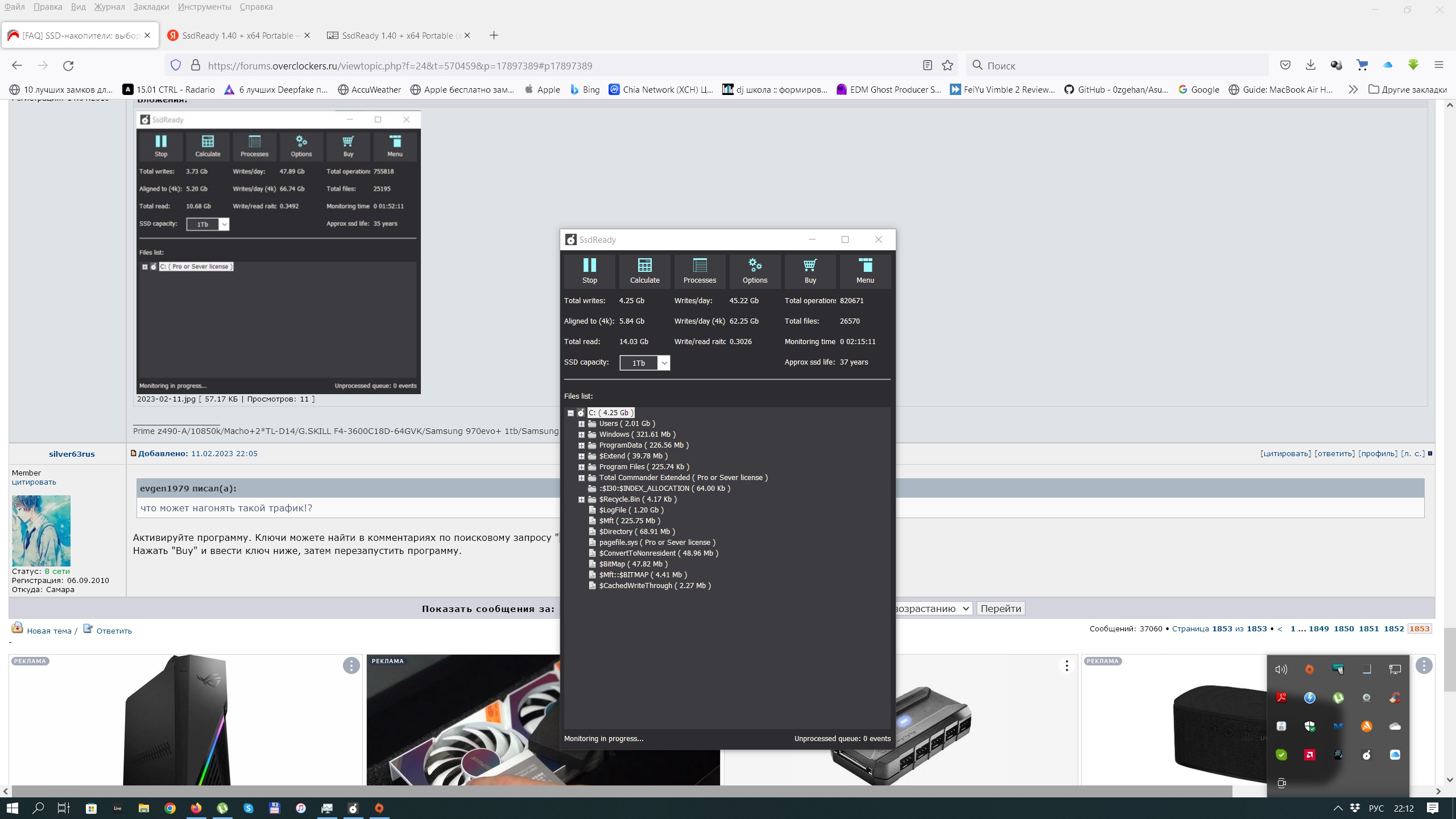 На всякий случай рекомендуется несколько дней понаблюдать за объёмами записи на накопитель с помощью SsdReady, потому как встречаются приложения, в определённой конфигурации генерирующие десятки гигабайт записи (на этом попадались защиты некоторых игр, антивирус Касперского, а также браузеры Google Chrome и Mozilla Firefox с некоторыми дополнительными расширениями).