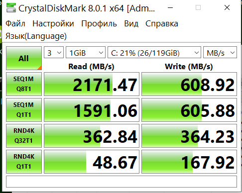 Так что между безбуферником за 2к.руб и рейдом 0 за 15.5к.руб секунда разницы. Есть еще MSI M390 250GB под системой, но вряд-ли он рекорд поставит. И sata-шный Seagate BarraCuda 120 на 500Гб потом попробовать, не подключен сейчас.