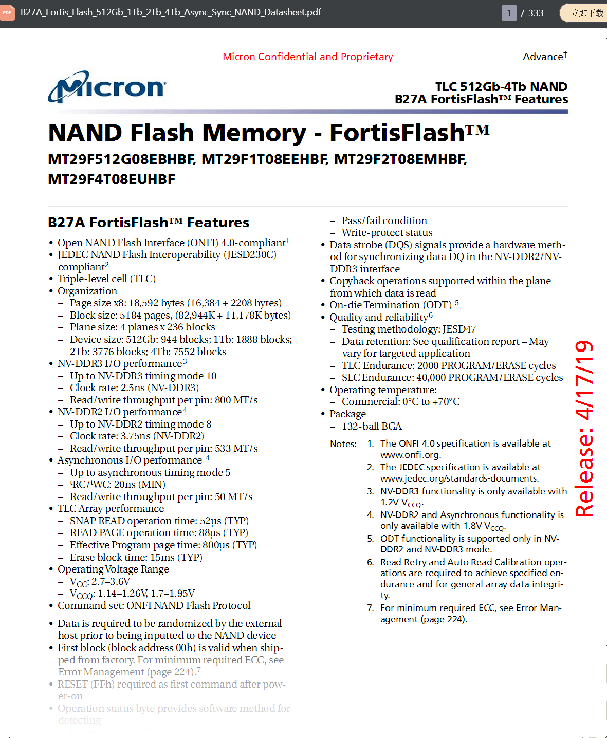Ну вот смотрите в приложенных вами документах b27a от микрона указано 2000 циклов (это как раз fortis flash т.е. лучшего качества, насколько пнимаю), что как раз отлично соотносится с защитыми в смарт данными которые я выше приводил. 1700 циклов получилось на накопителе MX500 с 33 прошивкой, который с 85 стираниями в смарт и -5%, он очевидно на не самом новом b47r и вероятно как раз на b27a. Для b0kb в документе ниже - 1500 циклов. Но это ведь не 3000? А для планарной mlc 3000 - было стандартом. Было много накопителей на планарной mlc с 5000 p/e циклов (Plextor M5Pro например).