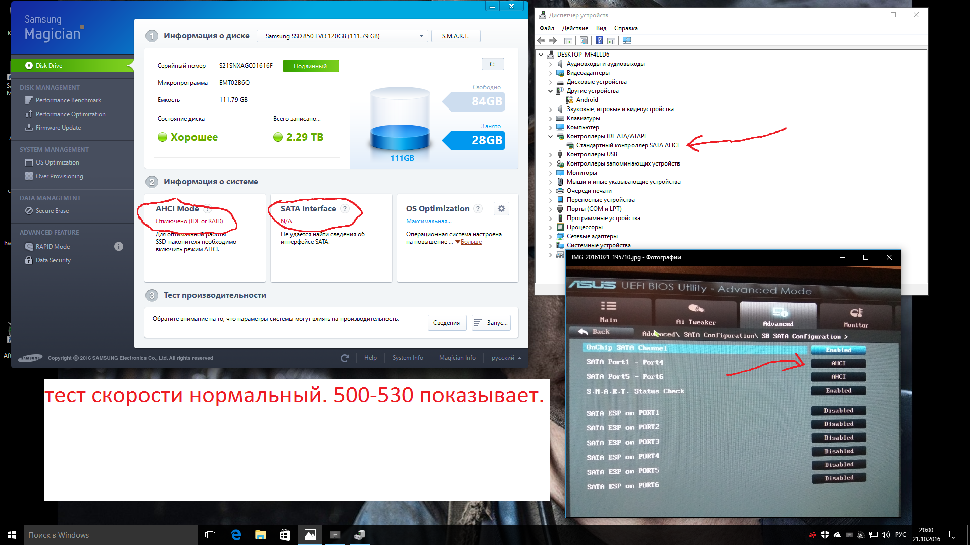 После переустановки винды стало так, установлены все драйвера с офсайта материнской платы https://www.asus.com/ru/Motherboards/SA ... _Download/ На прошлой винде все показывалось AHCI on, SATA 6.0 как на скринах выше.