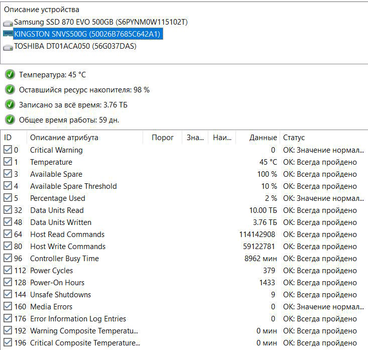 Подскажите по состоянию SSD. В теме "Помощь в решении проблем с HDD и SSD" спрашивал, там предположили, что возможно дело в шлейфе, но я проверял с разными и на разных компьютерах. Шлейф в порядке.