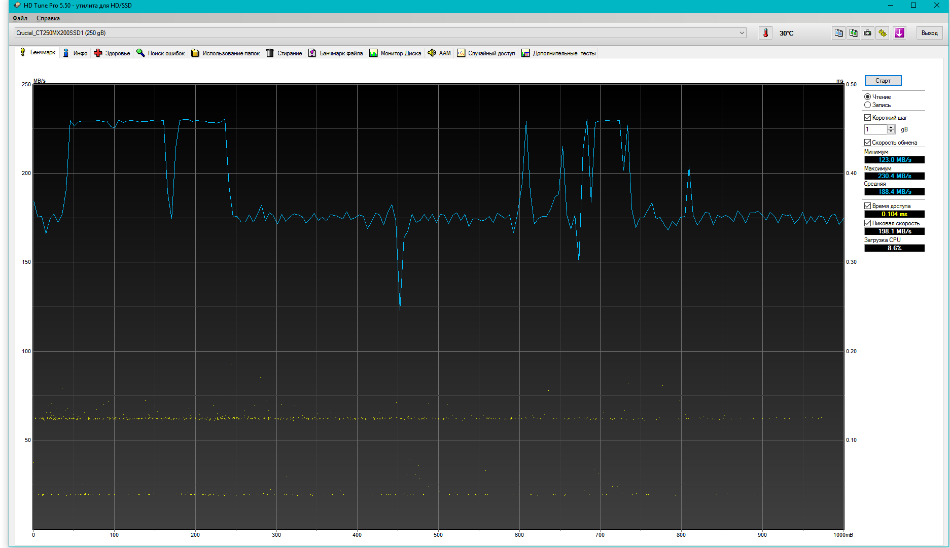 Здравствуйте. Как вам поведение системного диска Crucial MX200 250 GB на Windows 10 на SATA 2 контроллере (чипсет P35) - настройки тестирования: блок 4 кБ, полное в пределах 1 ГБ.