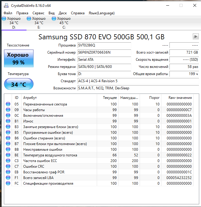 ========================================= Перед публикацией скриншотов Crystal Disk Info в меню "Сервис" >> "Дополнительно" >> "Raw-значения" выберите вариант "10 [DEC]". Это упростит восприятие информации. В меню "Сервис" ставьте галочку "Скрыть серийный номер".