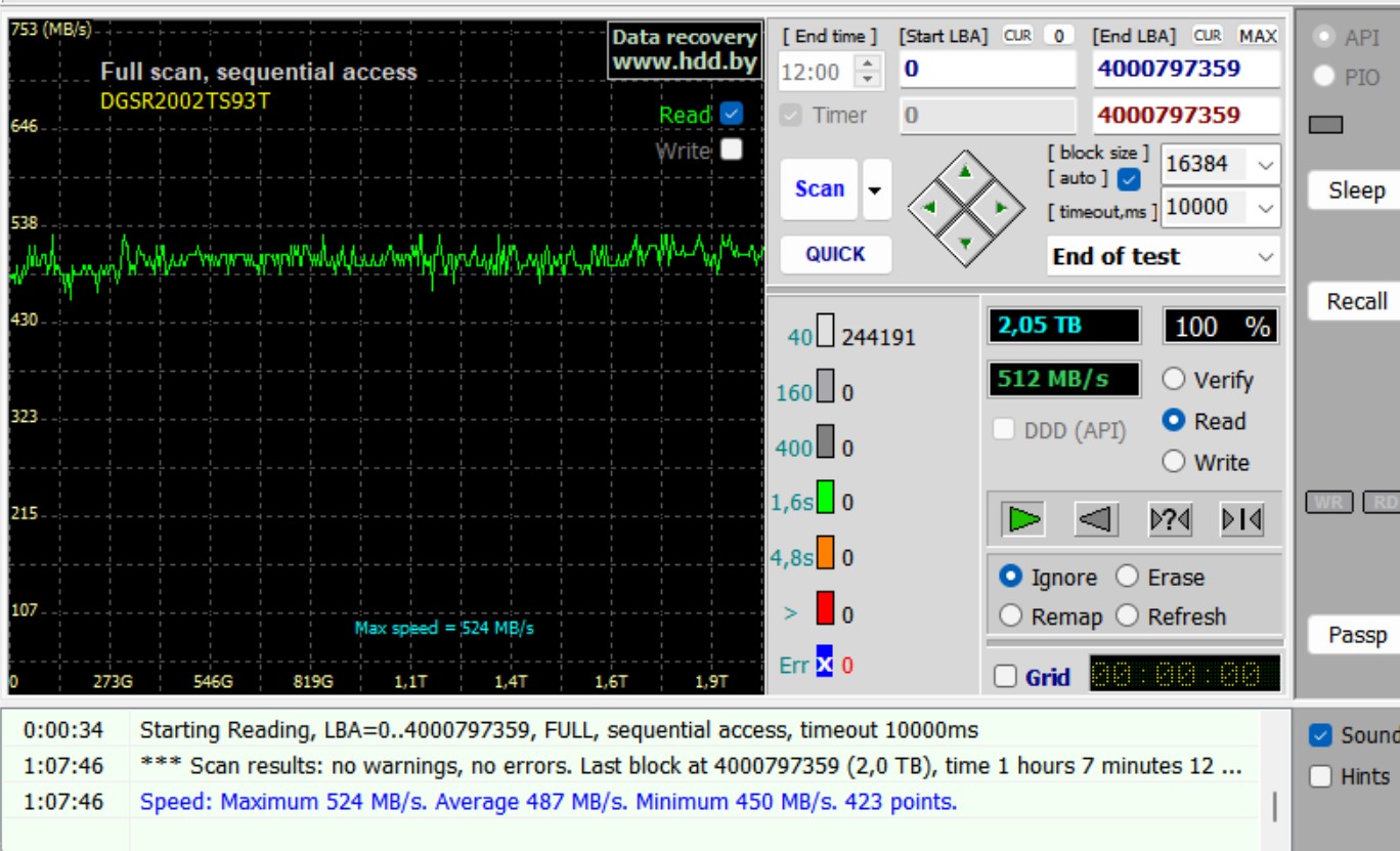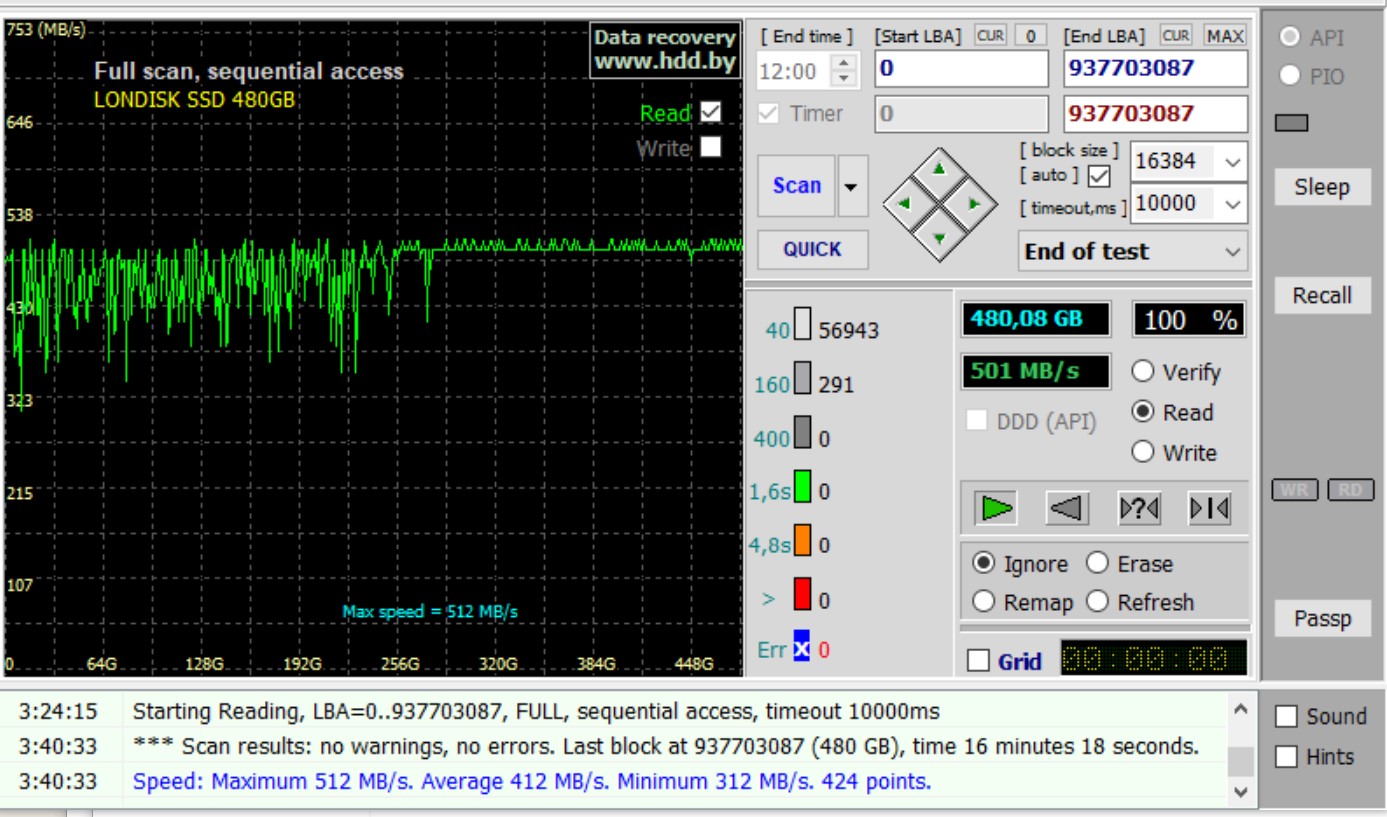 Обычное чтение всей поверхности. Вклдка "test and repair", там по умолчанию установлено справа "Read" и просто жмем SCAN. Снимаем галку "Grid" там где таймер считает время чтобы увидеть график.