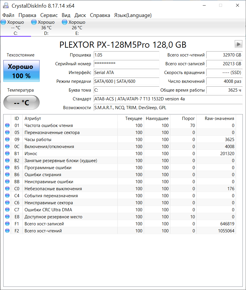 ========================================= Перед публикацией скриншотов Crystal Disk Info в меню "Сервис" >> "Дополнительно" >> "Raw-значения" выберите вариант "10 [DEC]". Это упростит восприятие информации. В меню "Сервис" ставьте галочку "Скрыть серийный номер".
