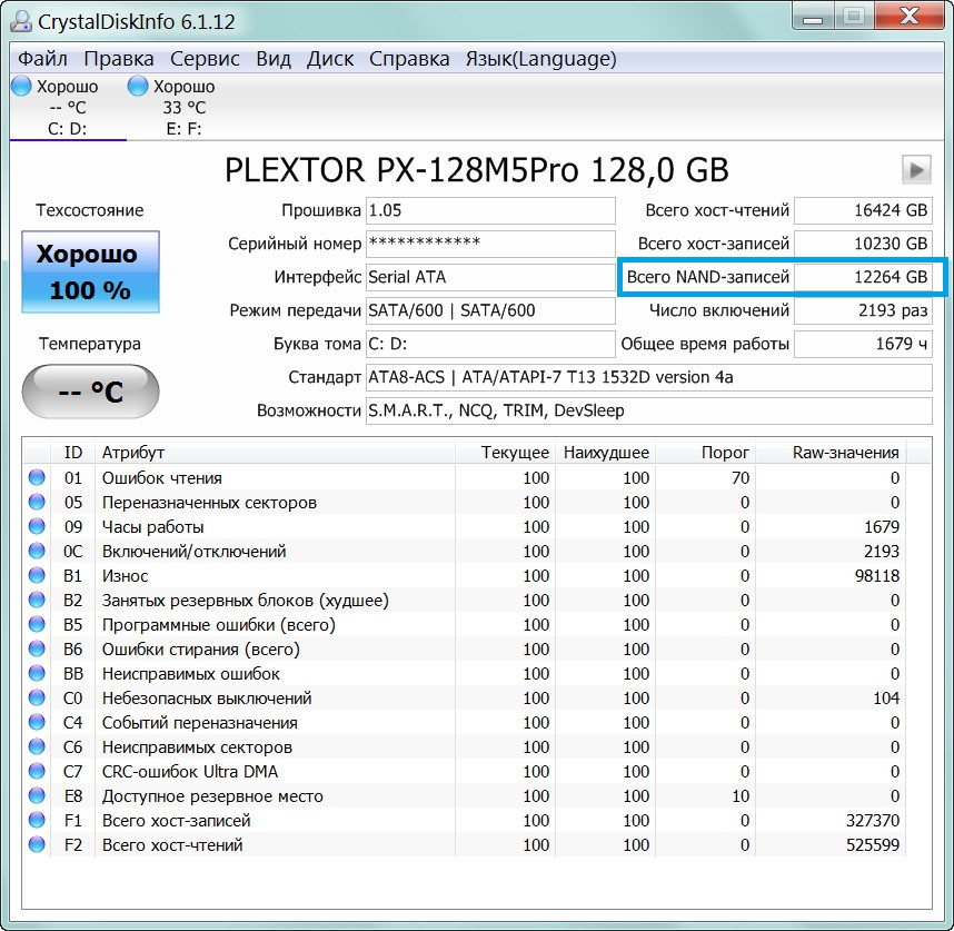 вот оно как. та я и не обращаю внимания на "показатель здоровья". если будут фатальные ошибки в smart пожелтеет или покраснеет. это на случай есть сам какой то из параметров не заметишь. износ считаю : В1 * на объем диска = объем записей в Mb , разделить на 1024 = объем записей в GB . по сути это кол-во NAND-записей, старенький CDI версии до 6.1.12 его и так показывал