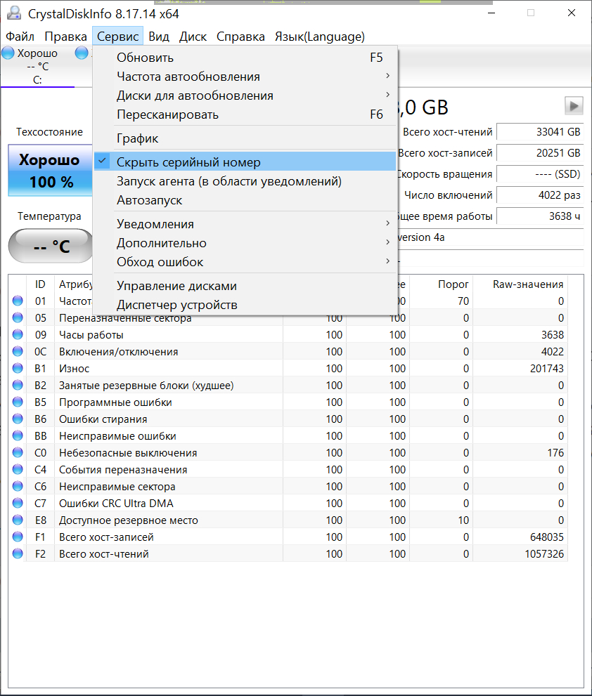 ========================================= Перед публикацией скриншотов Crystal Disk Info в меню "Сервис" >> "Дополнительно" >> "Raw-значения" выберите вариант "10 [DEC]". Это упростит восприятие информации. В меню "Сервис" ставьте галочку "Скрыть серийный номер".