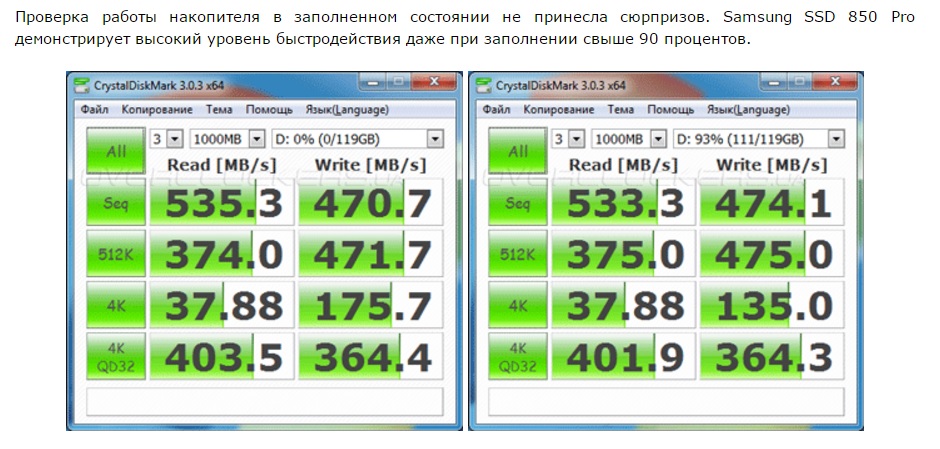 В предыдущих постах я озвучивал усреднённый обьем который может записать ориентировочный клиент,речь шла о 60-70% .И если на нормальном,среднем SSD с такой заполенностью, проблем обычно не возникает то на кингстонах с сандфорсами УЖЕ появляются микрофризы. Тоесть номинально речь шла об 60-70 % заполнености обьема . Хорошо, увеличим заполенность до 90-95 %, как вы обозначили .Но я смотрел тесты на Samsung 850 Prо при 93% заполнении обьема, и судя по всему по результатам , подтупливаний не ожидалось .В других тестах при полном заполнении на сколько это возможно ,всего обьема , количество операций плавно уменьшилось до 17 кіорс и даже при таких ситуациях соблюдается постоянство скорости записи. А тут пару постами выше говорили что и 7 кіорс довольно достаточно .