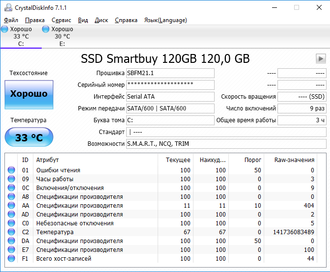========================================= Перед публикацией скриншотов Crystal Disk Info в меню "Сервис" >> "Дополнительно" >> "Raw-значения" выберите вариант "10 [DEC]". Это упростит восприятие информации. В меню "Сервис" ставьте галочку "Скрыть серийный номер".