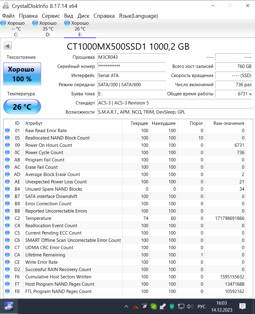 7. Для того что бы оценить состояние диска SSD воспользуйтесь прогнраммой Crystal Disk Info. Перед выкладыванием скриншотов Crystal Disk Info в меню Сервис>Дополнительно>Raw-значения выберите вариант "10 [DEC]" это несколько упростит восприятие информации.