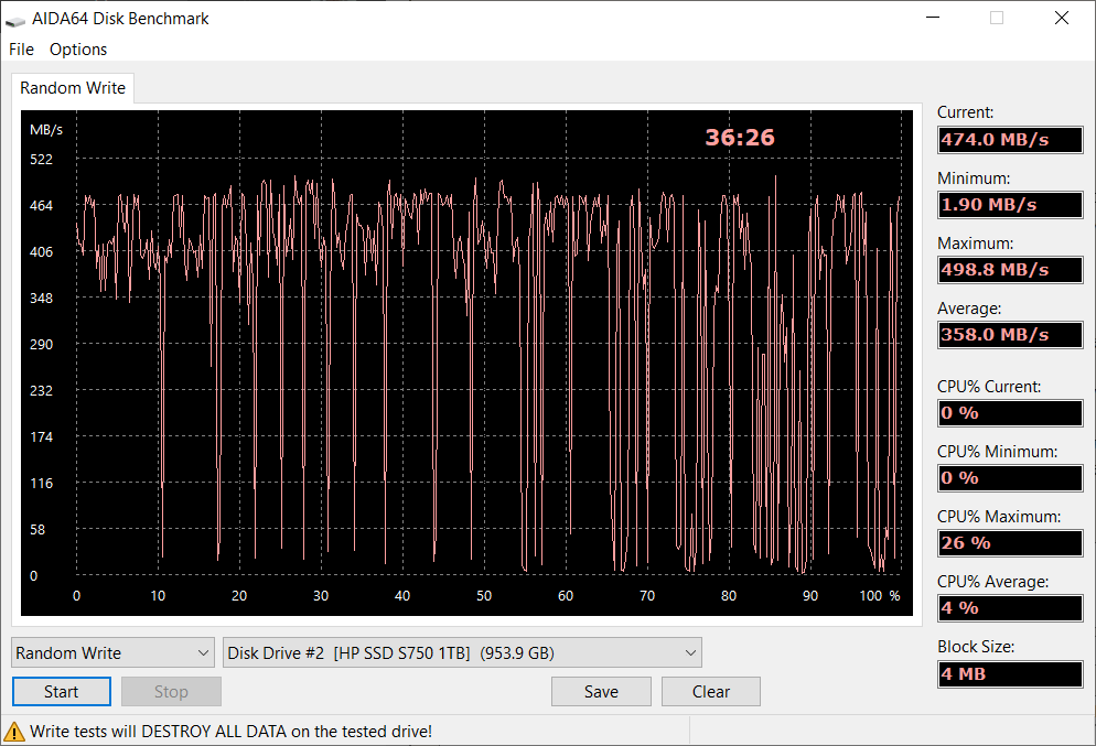 Ну это тест аида64 со случайной записью. Если я правильно понял, он пишет блоки по несколько мегабайт в случайные адреса. И по графику видно, что диску стало плохо раньше, чем при тесте линейной записи: на 10%, а не 30%. Т.е. SLC еще не успел исчерпаться и диск еще не начал сжимать данные по три бита на ячейку. Такое ощущение, что контроллеру просто стало тяжело обрабатывать таблицу трансляции, когда изменения в ней вносятся не линейно. Но почему это произошло, непонятно. Какая разница, какие адреса записать в таблицу, если доступ к самой таблице не замедляется, а запрошенные тестом адреса для записи это не физическое положение на ПЗУ, которое потребовало бы частых простоев для переключения банков. SSD же физически во флешку пишет туда, куда хочет, а не куда сказал софт. У dram дисков нет просадки в этом тесте ,в том числе sata. Да и у некоторых безбуферных nvme тоже нет. А значит это какой-то баг конкретной прошивки/контроллера этого HP, а не общее узкое место. Или же это узкое место sata контроллера, которое можно компенсировать dram буфером.