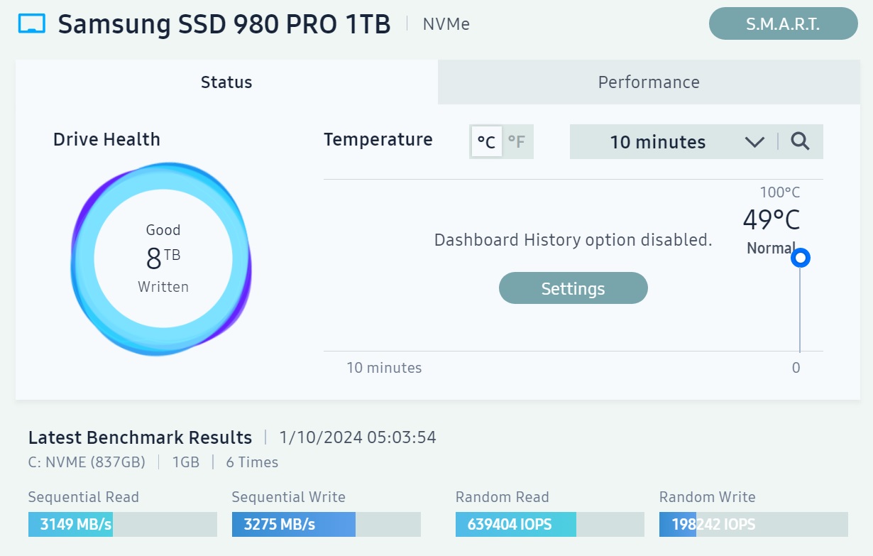 Приобрёл недавно 980PRO на 1 TB. Диск оригинал, всё довольно быстро, но смущает 1 факт - очень низкий iops в Samsung Magician, а именно random write. Стоит ли копать в эту сторону или это норма? На диске стоит винда 10. На линейные скорости обращать внимания не стоит, диск стоит в pci-e 3.0 x4 режиме, не думаю что это сказывается на iops.