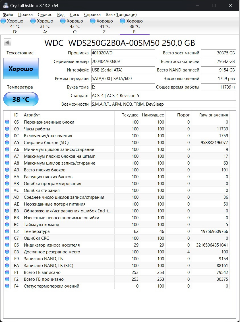 Подскажите по состоянию SSD. Синий SATA WDS250G2B0A на 250Gb Родственник принес комп, винда не стартует. Восстановить запуск не удалось. Подключил диск к другому ПК. Chkdsk шла на столько долго, что я не дождался окончания. Диск был заполнен на 100%, даже 1% не было свободно. Smart показывает 101 бэд. Скорости удручают. Данные вроде на месте. Удалил примерно 60 Гигов, но скорости лучше не стали. Как оценивать его состояние?