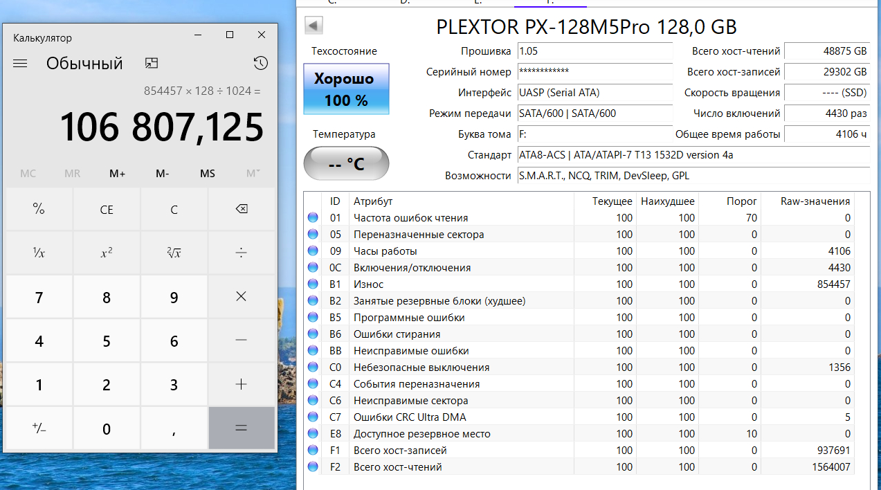 ресурс уже свой вроде выработал, была когда то инфа до 72ТВ, а здесь уже почти 107TB NAND-записей, а "здоровье" в CDI - 100% на часы работы можно не смотреть. с прошивкой FW 1.05 считает только фактическое время когда обращение к диску. с FW1.08 уже время работы от "Вкл до вЫкл".