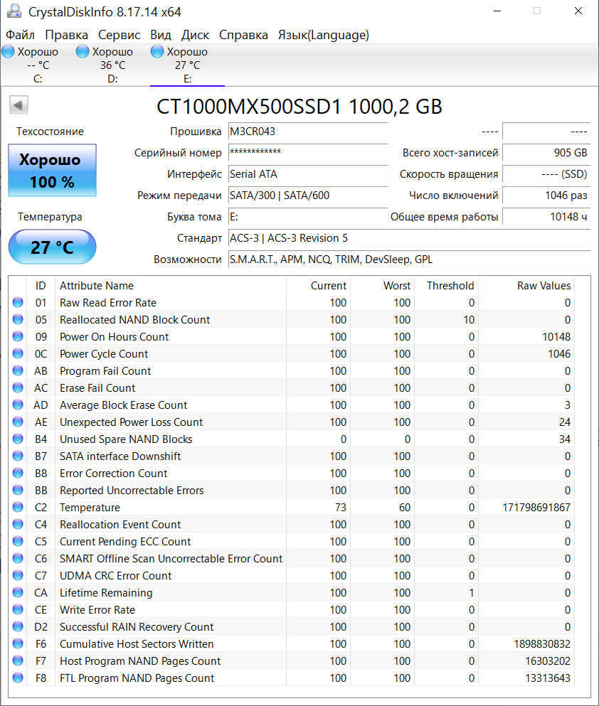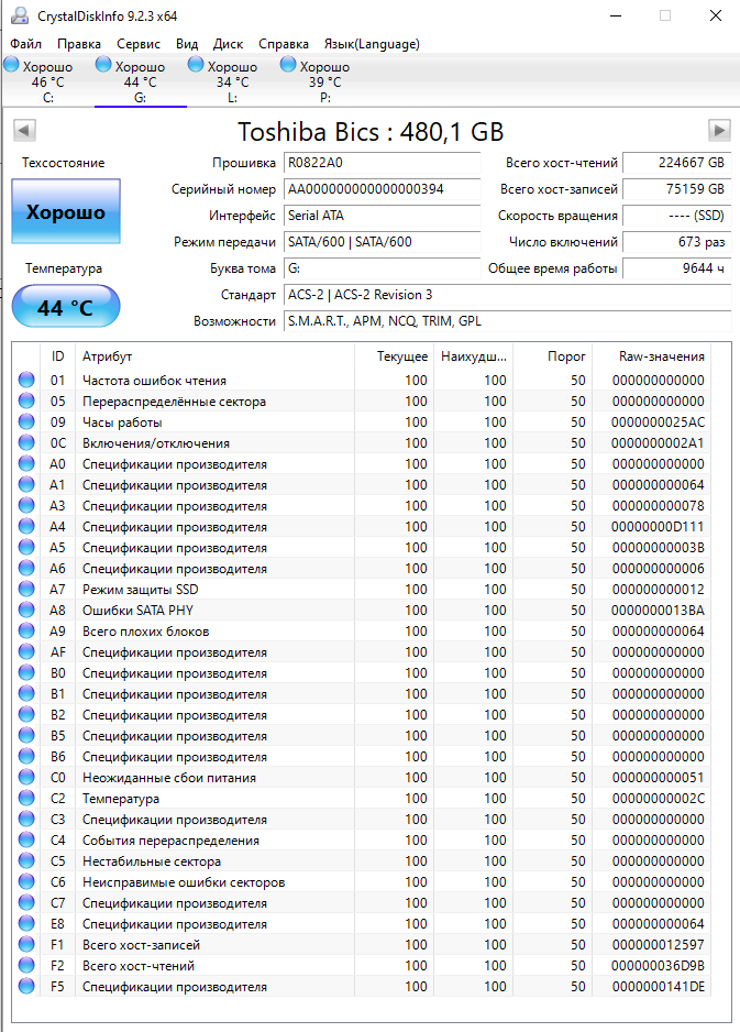 ========================================= Перед публикацией скриншотов Crystal Disk Info в меню "Сервис" >> "Дополнительно" >> "Raw-значения" выберите вариант "10 [DEC]". Это упростит восприятие информации. В меню "Сервис" ставьте галочку "Скрыть серийный номер".
