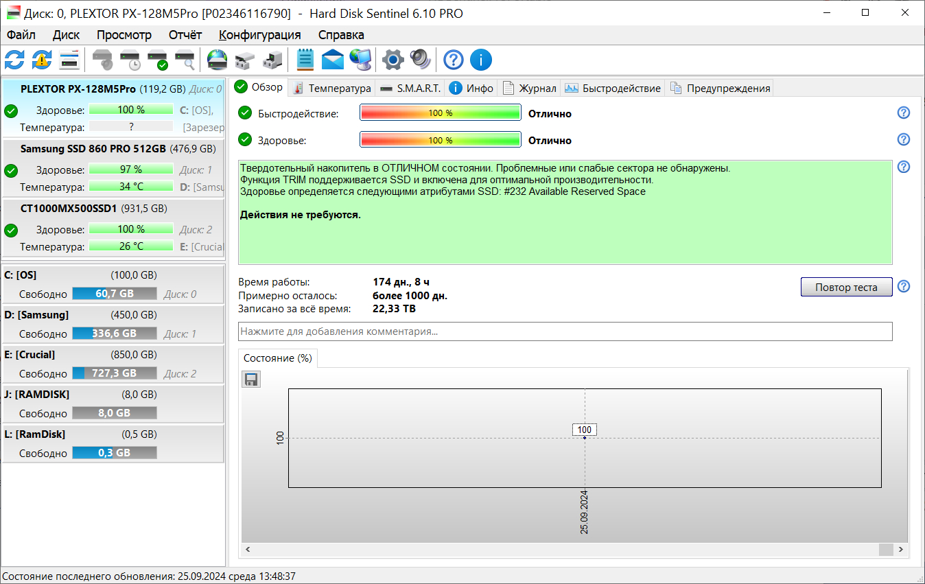 8. Различные оценивалки "здоровья накопителя" показывают теорию, предугадать проблемы они не могут. Например, Plextor M7V даже с протёртым до предела флешем будут оцениваться как "здоровый".