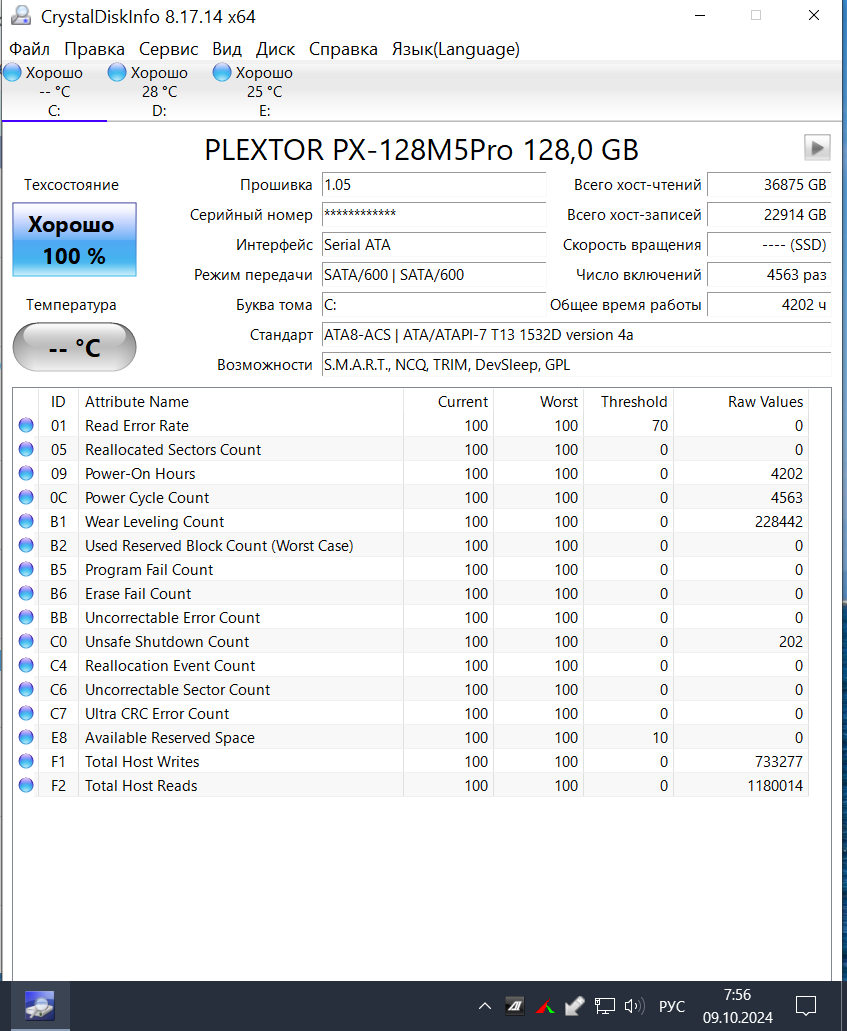 ========================================= Перед публикацией скриншотов Crystal Disk Info в меню "Сервис" >> "Дополнительно" >> "Raw-значения" выберите вариант "10 [DEC]". Это упростит восприятие информации. В меню "Сервис" ставьте галочку "Скрыть серийный номер".