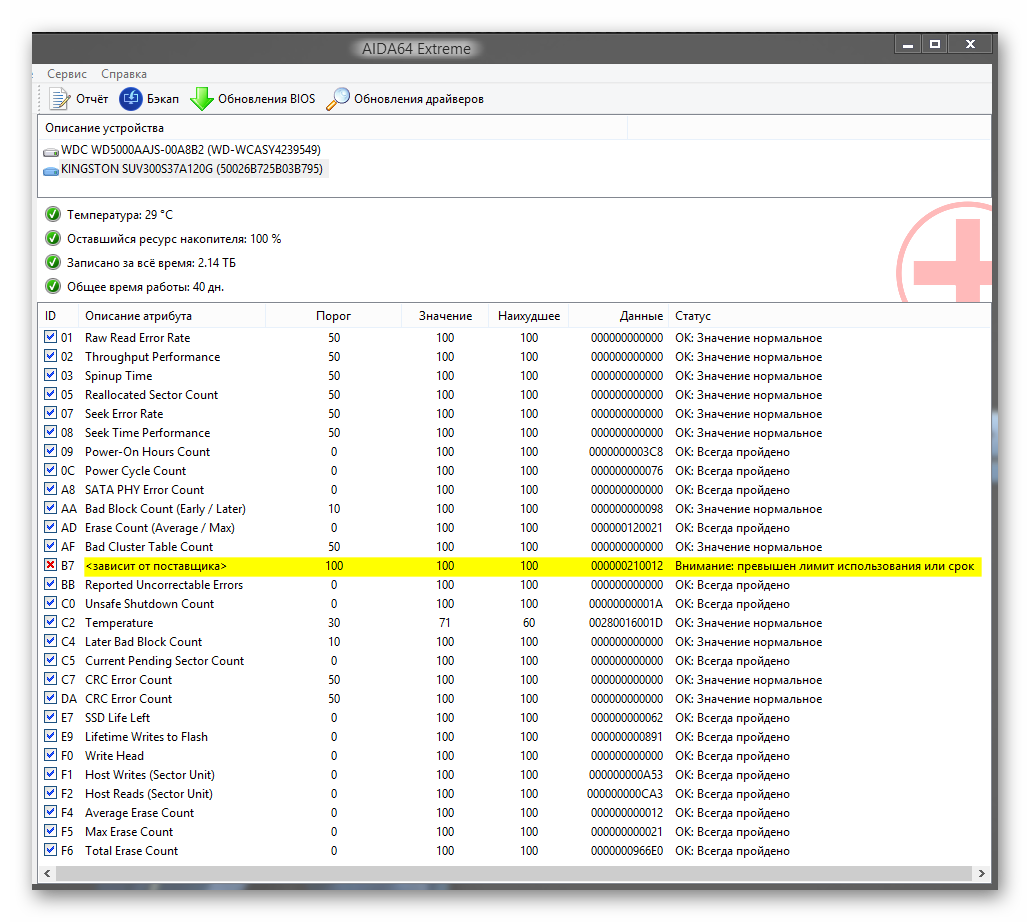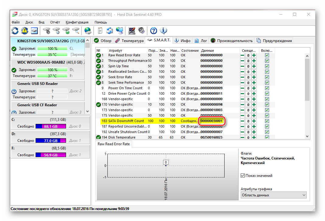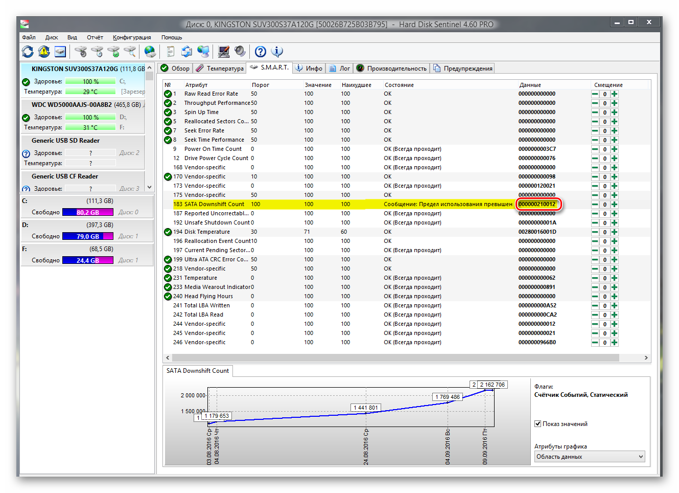 Здравствуйте, прошу совета... Чуть больше месяца назад, приобрёл "KINGSTON SUV300S37A120G" (пока правда использую в режиме SATA II), ну вот одно из значений "183. SATA Downshift Count" заставило за волноваться, так как значение растёт