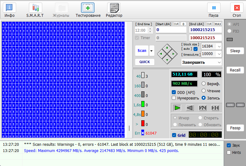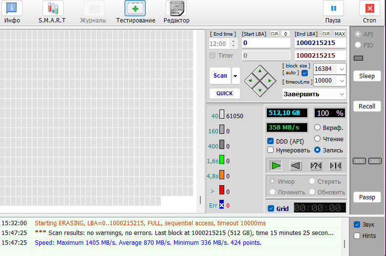 Есть еще один тест: "wr LBA num" - прописывает текущий LBA номер в сектора. Т.е. в нулевой сектор запишет 0, в первый 1, во второй 2 и т.д. На следующей вкладке Disk Editor можно прочитать произвольный сектор и сравнить записанное значение. Так по крайней мере работает на HDD.