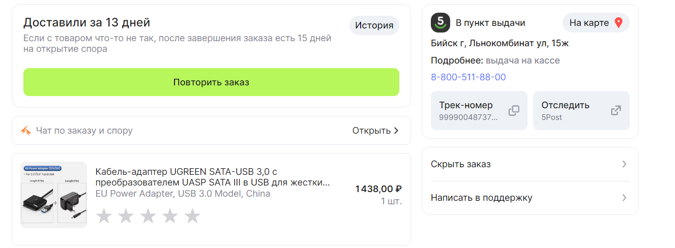 Мне ненравится, что мой товар прибыл на адрес почты, который я указал на аликспрессе, но после прибытия он бегает по сортировочным центрам и оказывается, что я свой товар не могу взять там куда я указал, а только там, где я прописал. На почте говорят, что при заказе надо указывать до востребования, но я такой функции не нашел на алике, и боюсь, что мой ссд придет каким попало, после такого туризма.