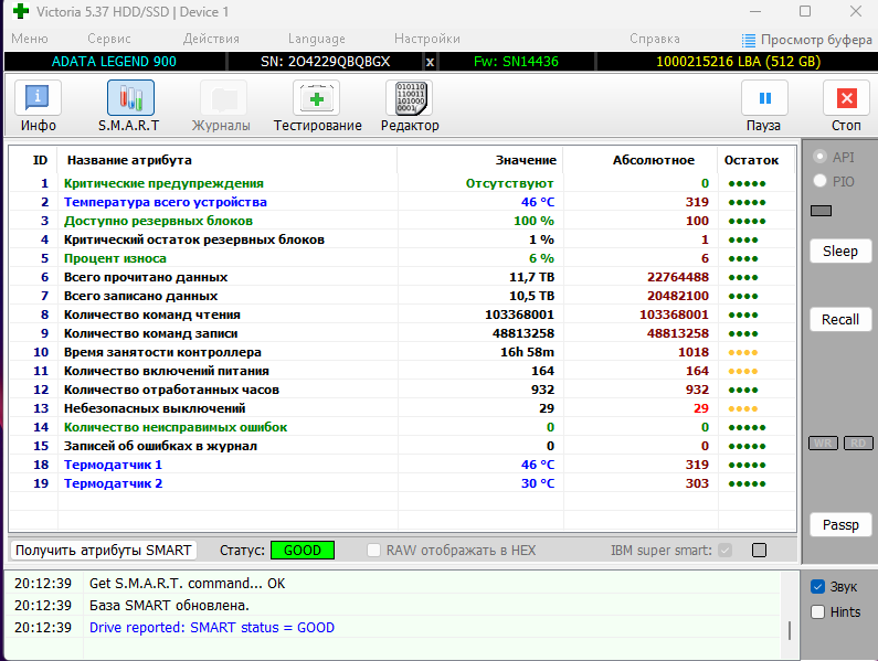 7. Для того что бы оценить состояние диска SSD воспользуйтесь прогнраммой Crystal Disk Info. Перед выкладыванием скриншотов Crystal Disk Info в меню Сервис>Дополнительно>Raw-значения выберите вариант "10 [DEC]" это несколько упростит восприятие информации.