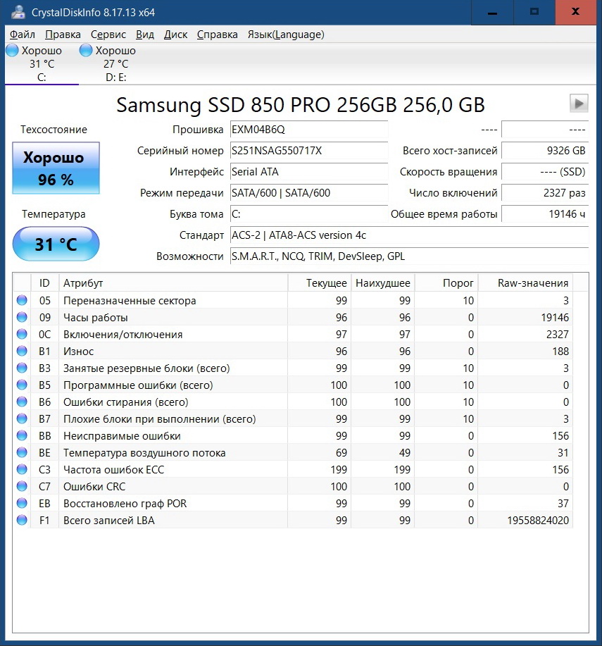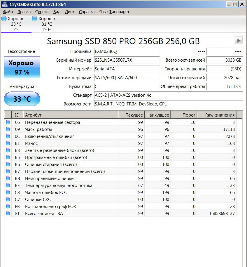 ========================================= Перед публикацией скриншотов Crystal Disk Info в меню "Сервис" >> "Дополнительно" >> "Raw-значения" выберите вариант "10 [DEC]". Это упростит восприятие информации. В меню "Сервис" ставьте галочку "Скрыть серийный номер".