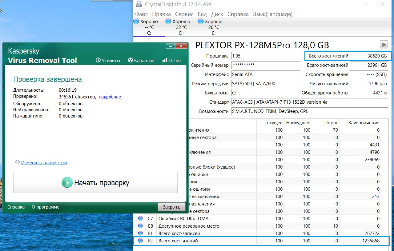 ========================================= Перед публикацией скриншотов Crystal Disk Info в меню "Сервис" >> "Дополнительно" >> "Raw-значения" выберите вариант "10 [DEC]". Это упростит восприятие информации. В меню "Сервис" ставьте галочку "Скрыть серийный номер".