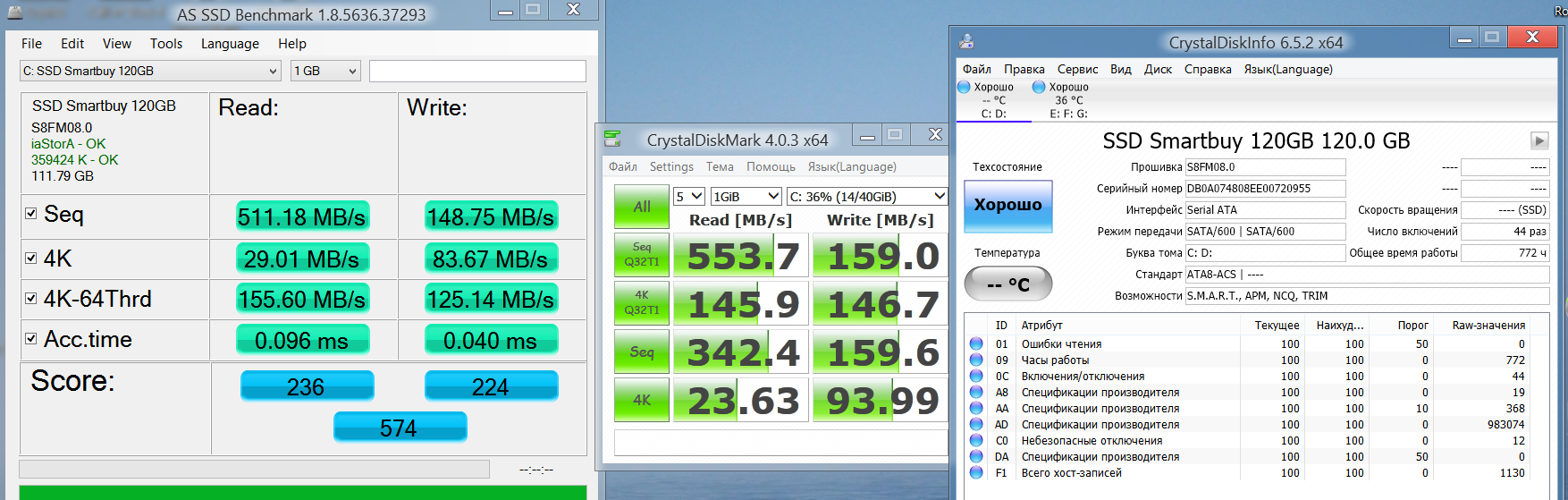 С оговоркой эксплуатации на штатном драйвере msahci (драйвер Intel [он же iaStorA, IRST] на контроллер SATA не ставить): - SmartBuy Ignition 2, GoodRAM C50/100, PQI S522, Corsair Force LS 240 Гбайт**, Patriot Blaze 240 Гбайт*** и прочие Phison-based (контроллер Phison; за полным списком лучше заглянуть в FAQ); Проблема заключается в падении скоростных характеристик на операциях записи. По отзывам, встречается при прошивке версии 7.7. Исправляется обновлением прошивки до версии 7.9 (после чего может потребоваться выполнение Secure Erase).