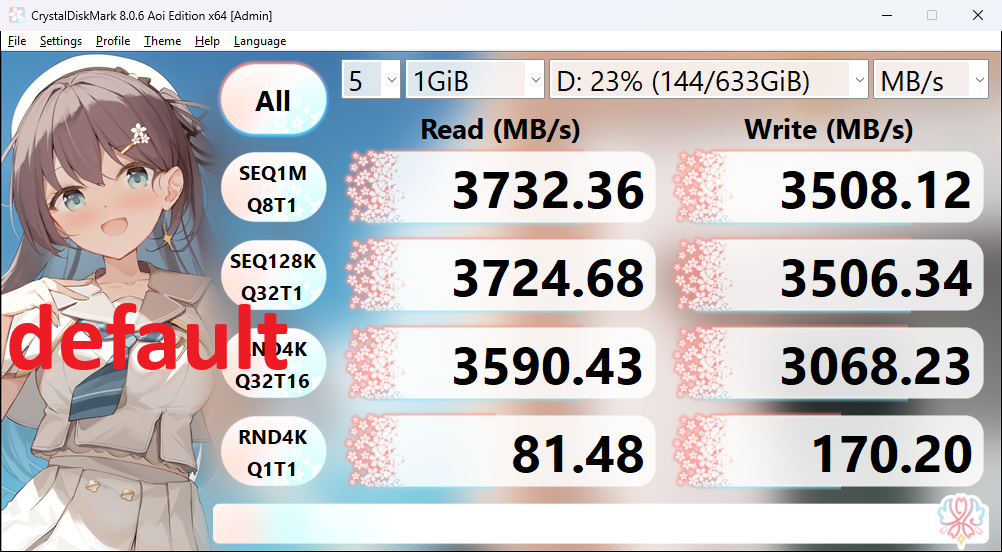 Результаты с разными профилями теста, параллельно - один поток winrar Материнка x370, проц 3950х, ssd 990pro установлен в слот pci-e x16 (реально х8) через переходник, подключение определяется как pci-e 3.0 x4
