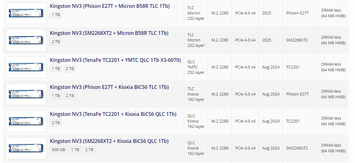 ultrauma, ты еще здесь?:D мы думали уже убежал SSD покупать. Kingston NV3 - Phison PS5027-E27T,(возможны варианты - TenaFE TC2201 и Silicon Motion SM2268XT2) чипы Toshiba 162L BiCS6 TLC, или с QLC, кому как попадет, все данные и обзоры есть в свободном доступе. изучай.