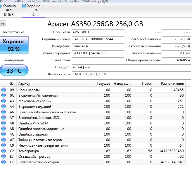 ========================================= Перед публикацией скриншотов Crystal Disk Info в меню "Сервис" >> "Дополнительно" >> "Raw-значения" выберите вариант "10 [DEC]". Это упростит восприятие информации. В меню "Сервис" ставьте галочку "Скрыть серийный номер".